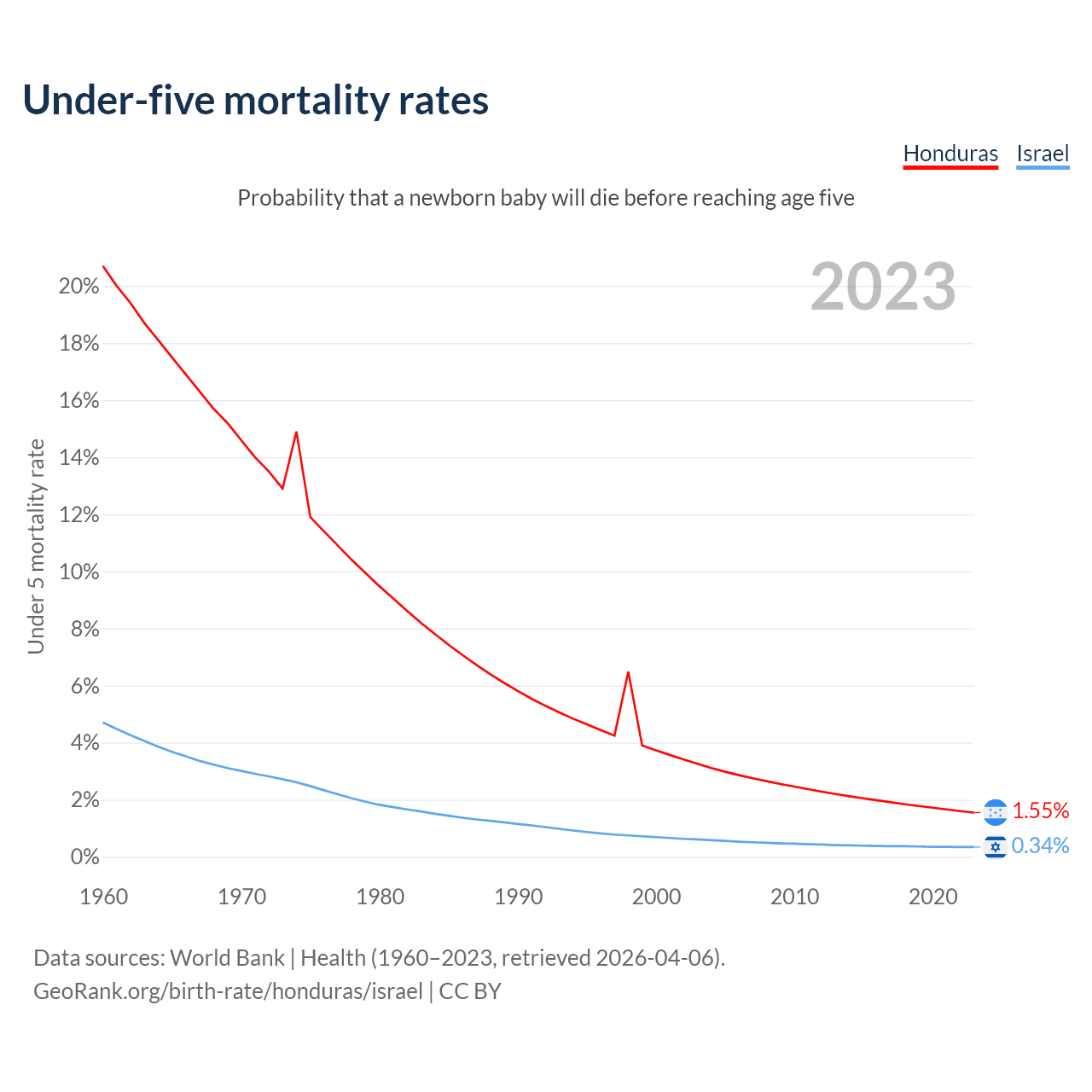 The chance that a newborn baby will die before reaching age five is 1.55% in Honduras and 0.34% in Israel. Above is a chart with historical data on under-five mortality rates.