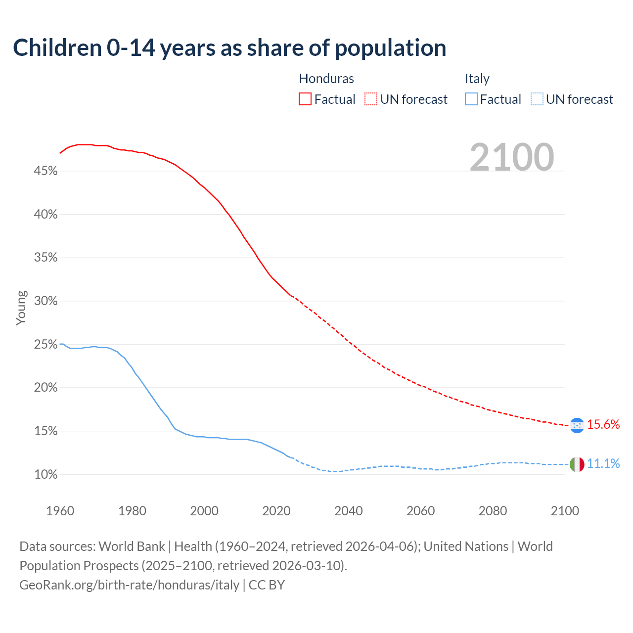 According to the latest available data on birth rates, the fertility rate in Honduras was 2.5 children per woman in 2023, compared to 1.2 in Italy in 2023. The replacement level is considered to be 2.1 children per woman.