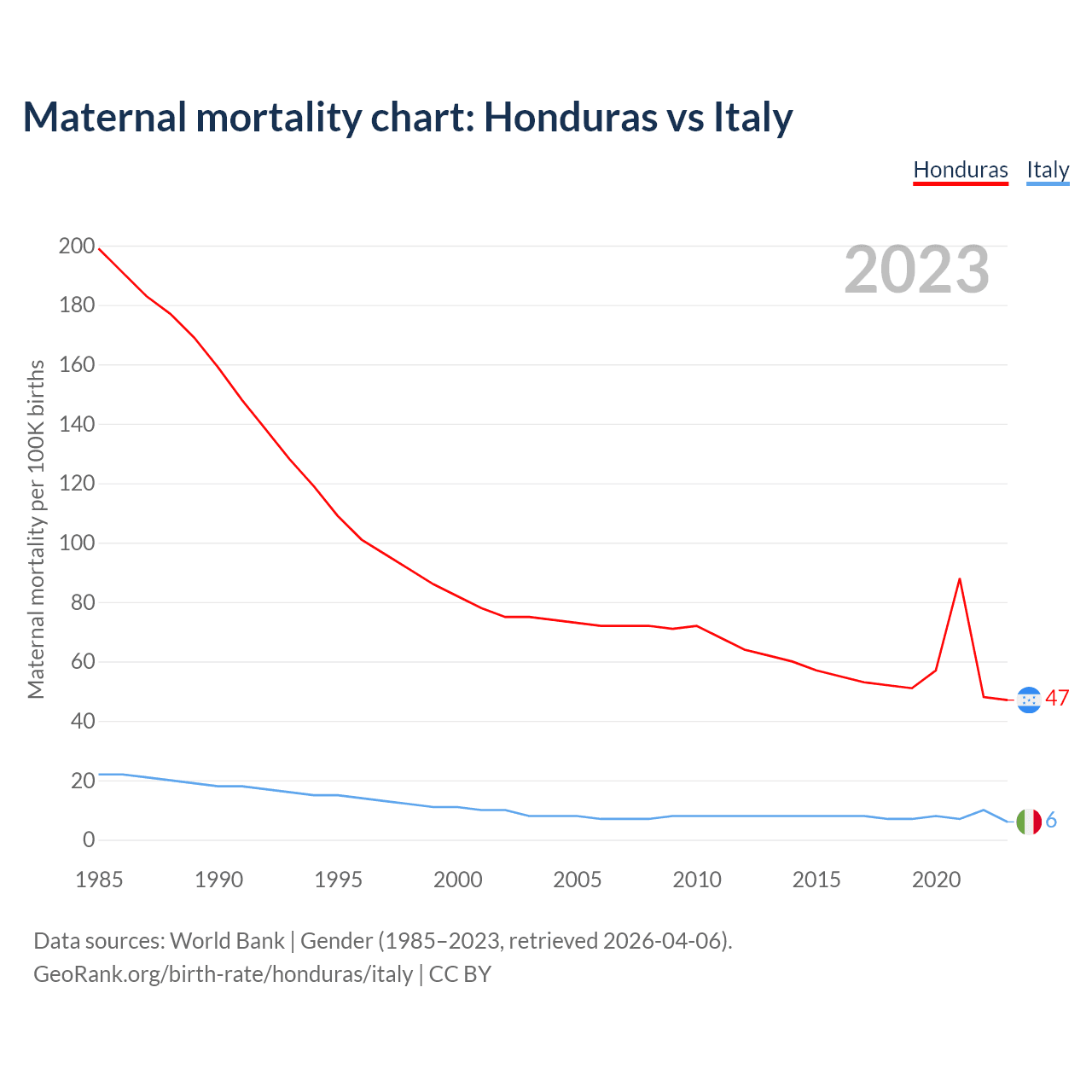 The maternal mortality rate, which is the probability of dying during childbirth or within 42 days of pregnancy termination, is 47 deaths per 100,000 live births in Honduras, compared to 6 deaths in Italy.
