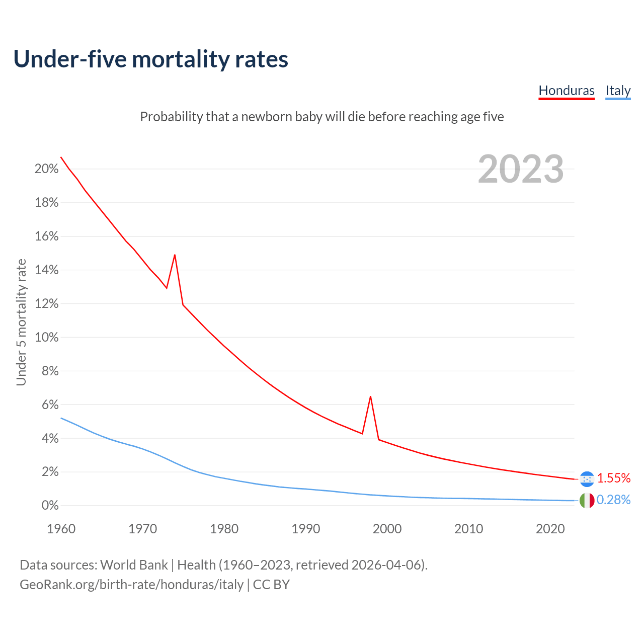 The chance that a newborn baby will die before reaching age five is 1.55% in Honduras and 0.28% in Italy. Above is a chart with historical data on under-five mortality rates.