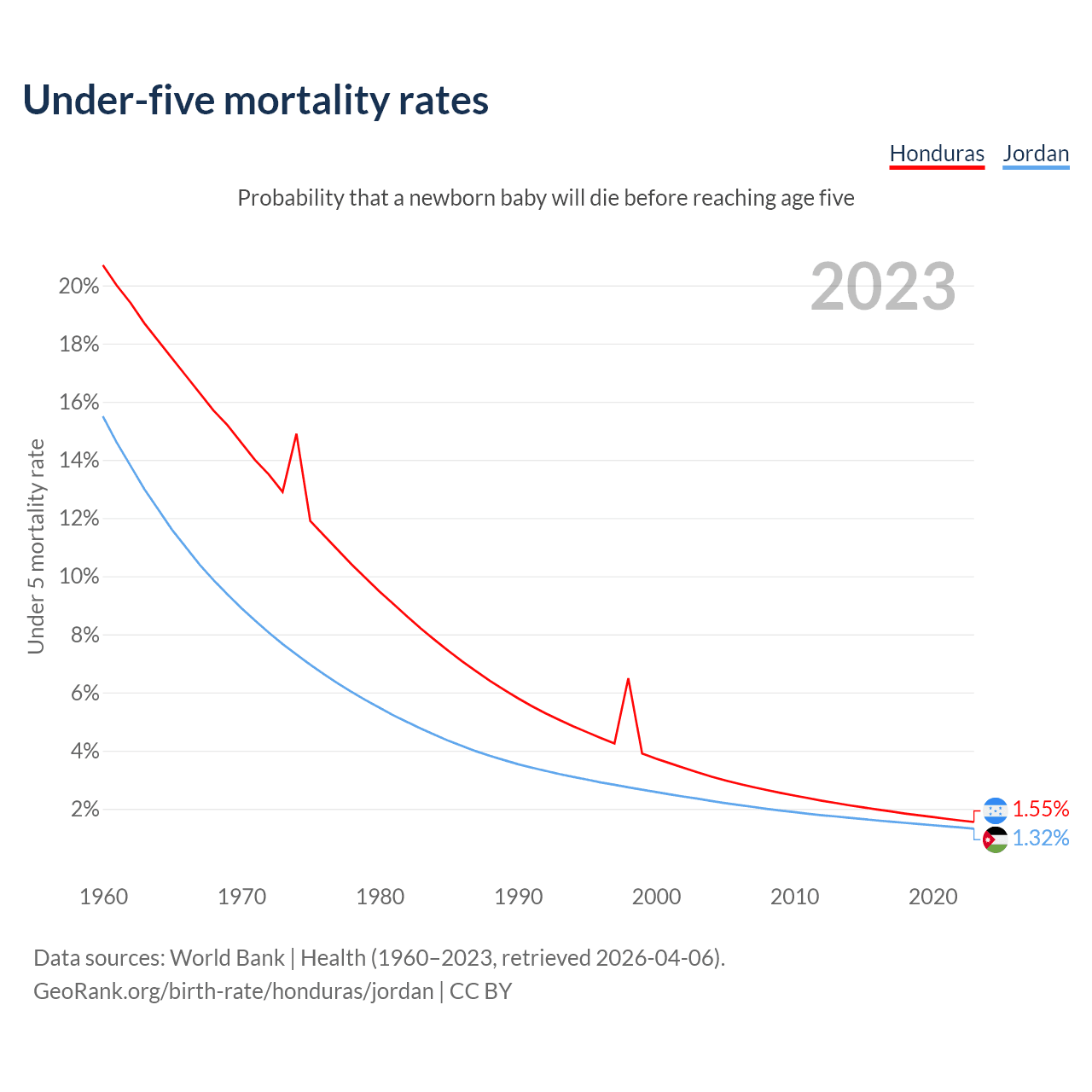 The chance that a newborn baby will die before reaching age five is 1.55% in Honduras and 1.32% in Jordan. Above is a chart with historical data on under-five mortality rates.