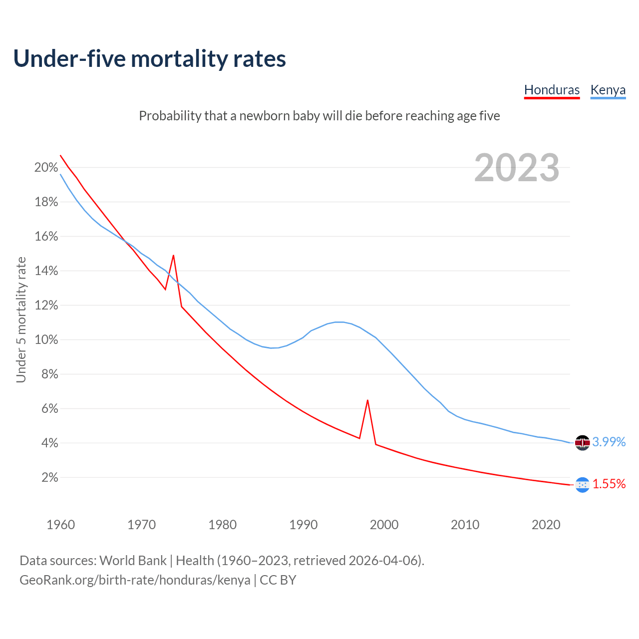 The chance that a newborn baby will die before reaching age five is 1.55% in Honduras and 3.99% in Kenya. Above is a chart with historical data on under-five mortality rates.