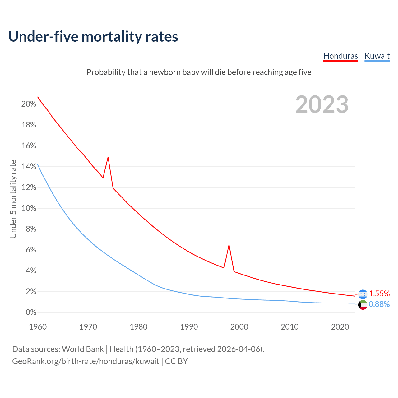 The chance that a newborn baby will die before reaching age five is 1.55% in Honduras and 0.88% in Kuwait. Above is a chart with historical data on under-five mortality rates.