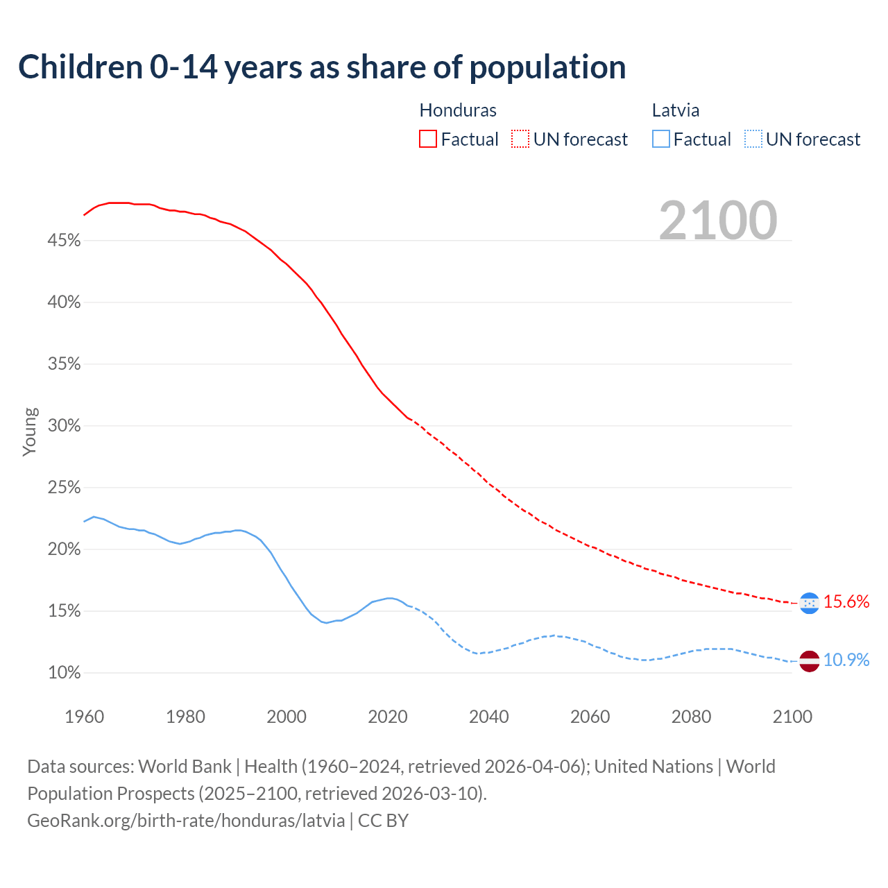 According to the latest available data on birth rates, the fertility rate in Honduras was 2.5 children per woman in 2023, compared to 1.36 in Latvia in 2023. The replacement level is considered to be 2.1 children per woman.