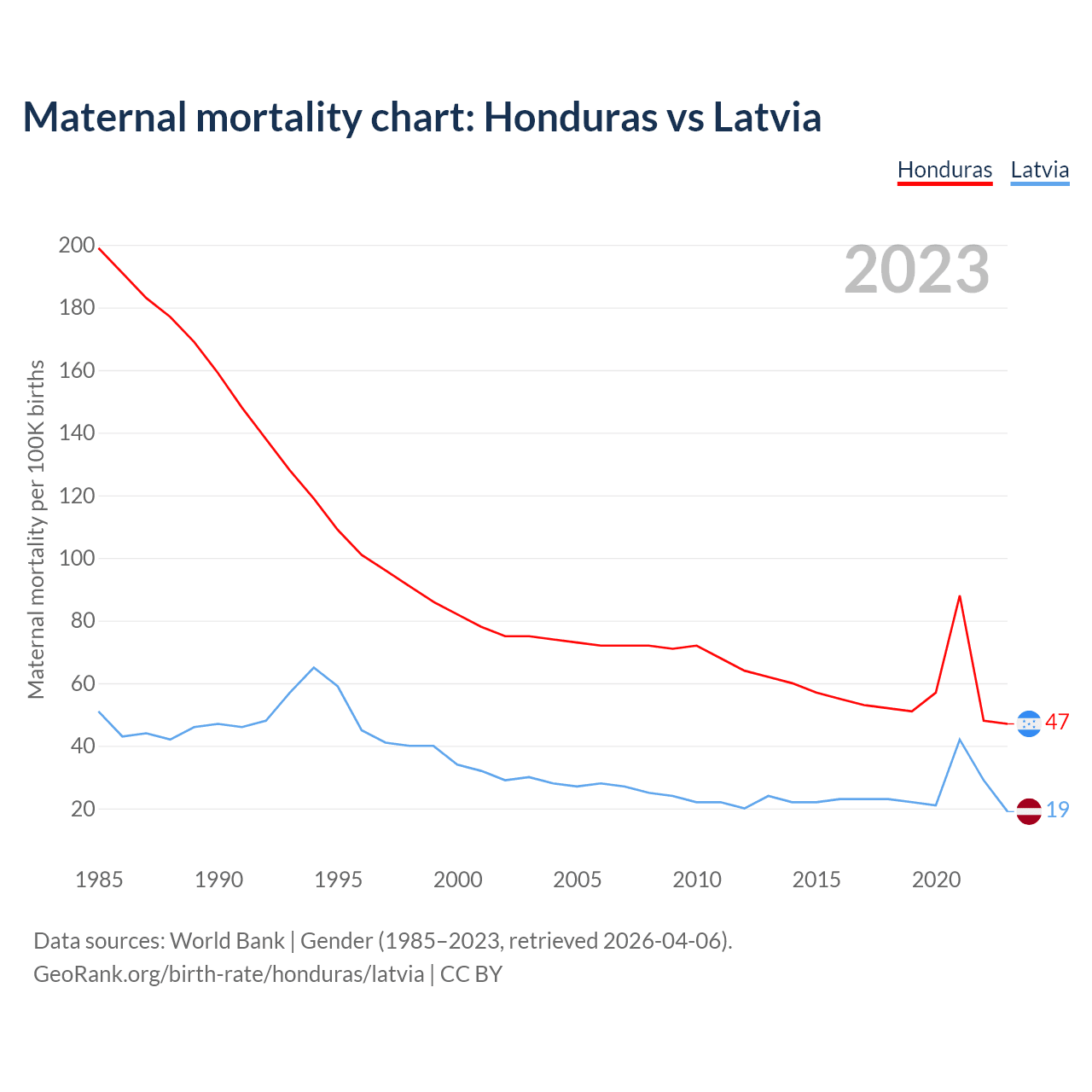 The maternal mortality rate, which is the probability of dying during childbirth or within 42 days of pregnancy termination, is 47 deaths per 100,000 live births in Honduras, compared to 19 deaths in Latvia.