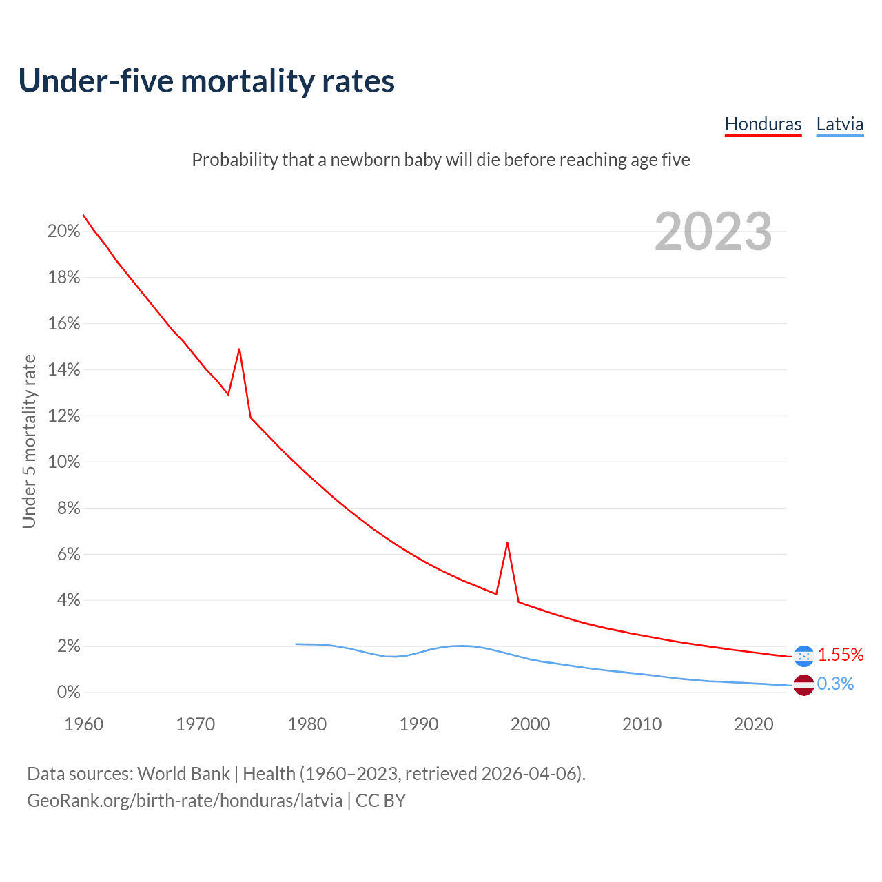 The chance that a newborn baby will die before reaching age five is 1.55% in Honduras and 0.3% in Latvia. Above is a chart with historical data on under-five mortality rates.