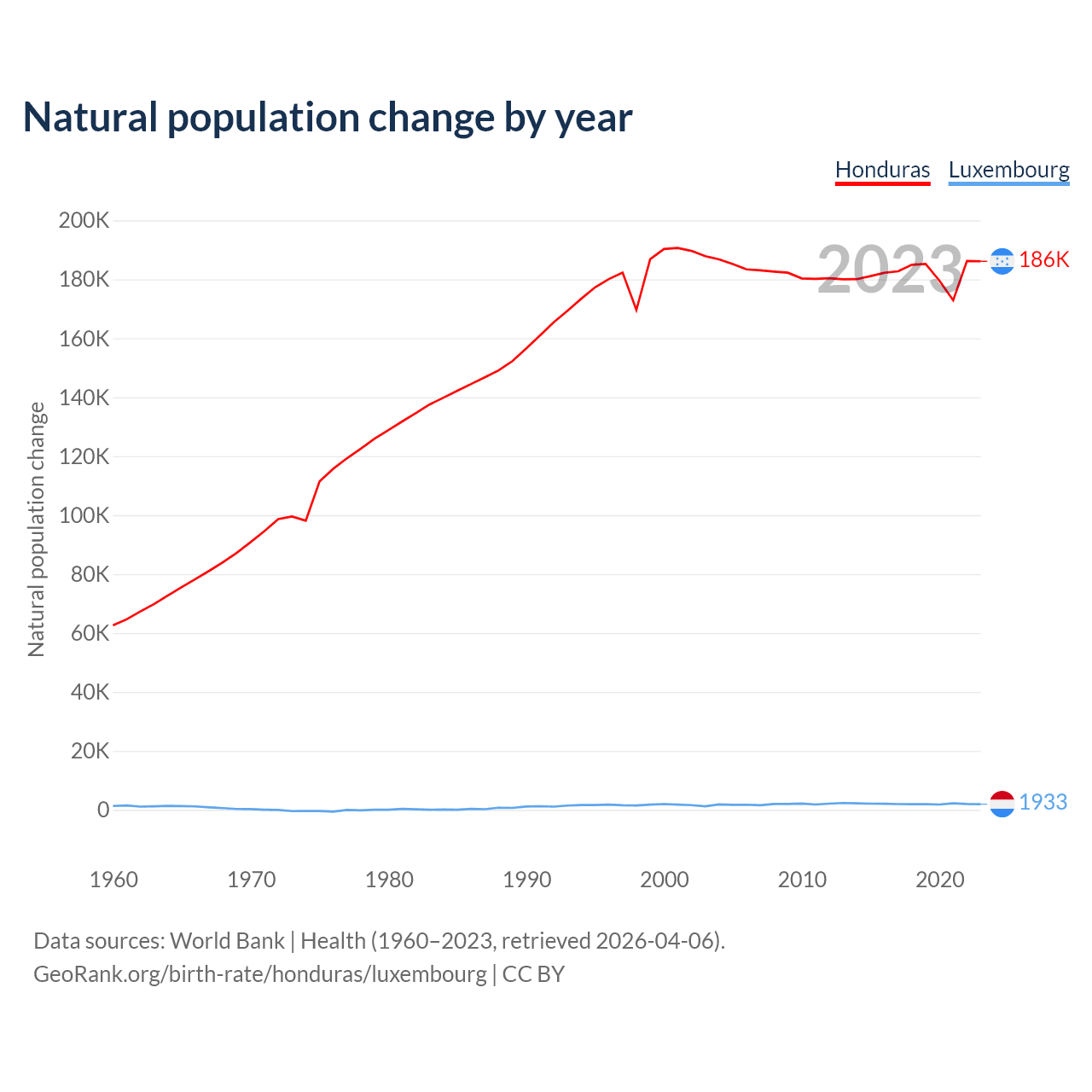 Honduras has an annual birth rate of 22 births per 1,000 people, compared to 9.5 for Luxembourg. The average number of children a woman is expected to have during her lifetime — the fertility rate, is 2.5 in Honduras and 1.25 in Luxembourg — 50% difference.