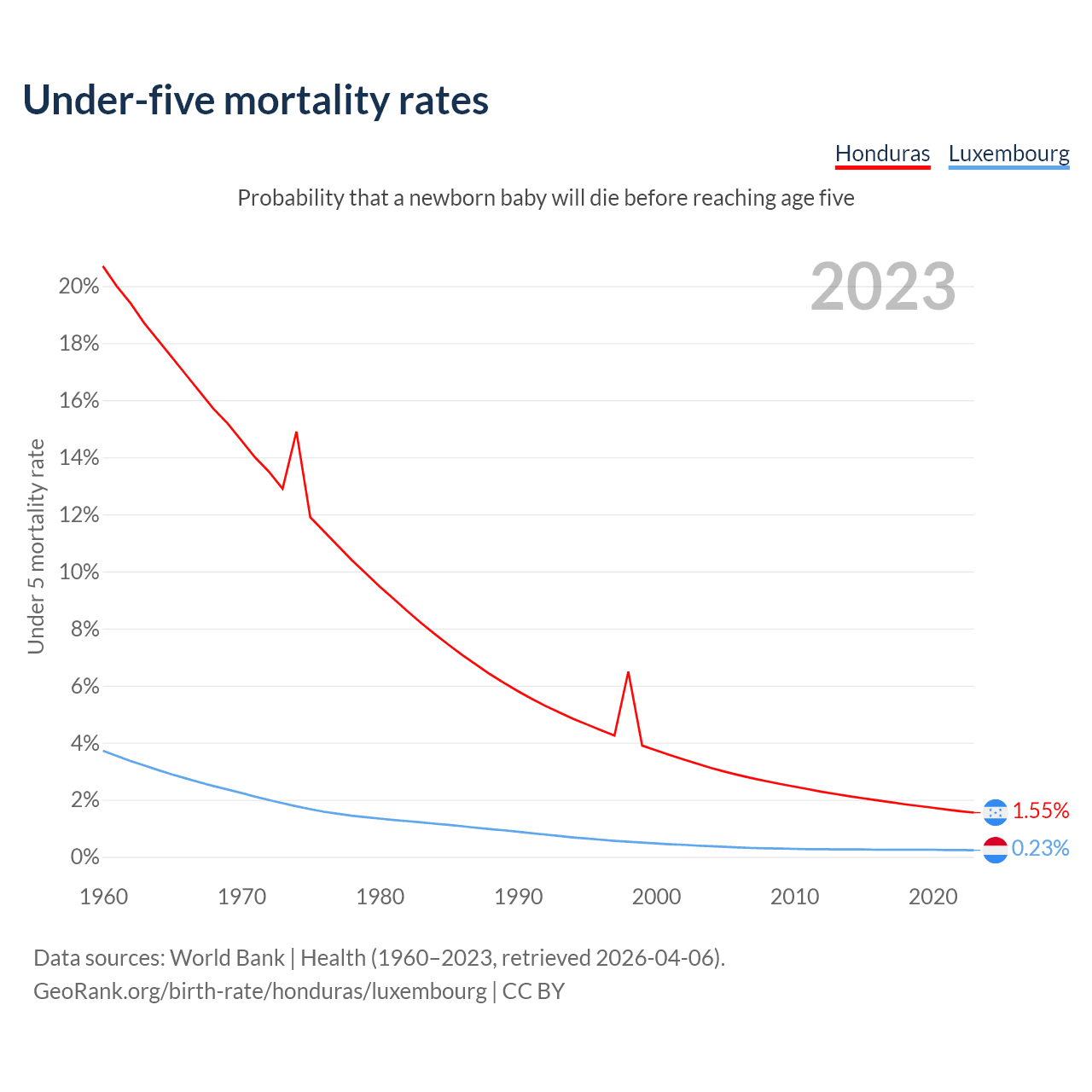 The chance that a newborn baby will die before reaching age five is 1.55% in Honduras and 0.23% in Luxembourg. Above is a chart with historical data on under-five mortality rates.