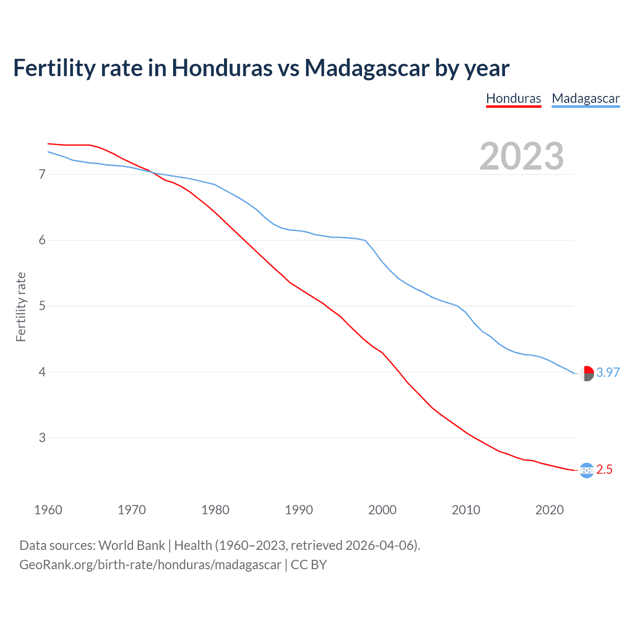 1960 vs 2023, the fertility rate has decreased by 66.5% in Honduras and by 45.9% in Madagascar — in 1960, it was 7.46 and 7.34, respectively.