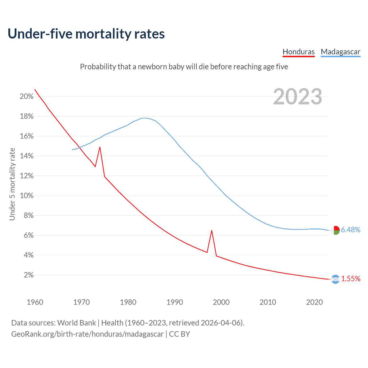 The chance that a newborn baby will die before reaching age five is 1.55% in Honduras and 6.48% in Madagascar. Above is a chart with historical data on under-five mortality rates.