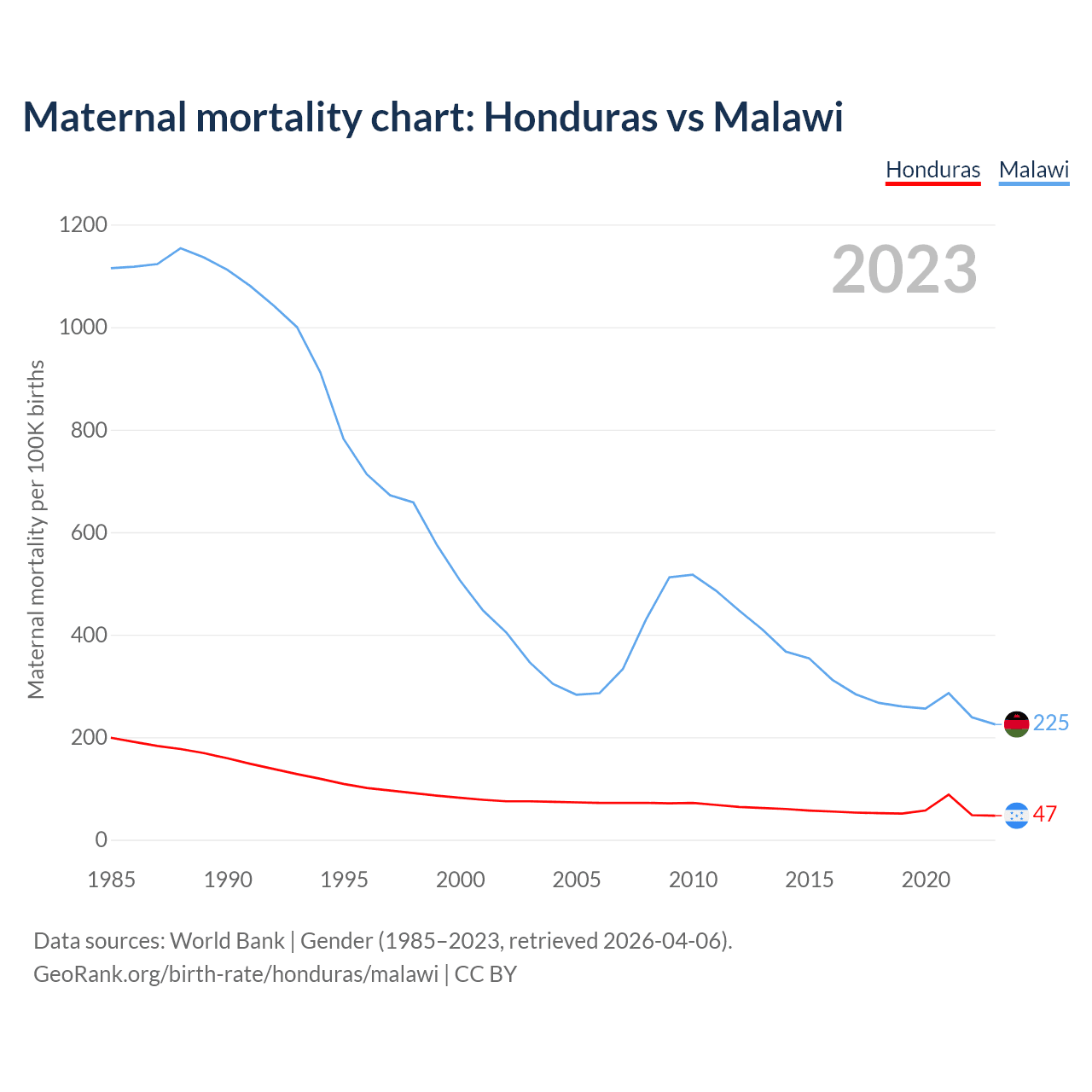 The maternal mortality rate, which is the probability of dying during childbirth or within 42 days of pregnancy termination, is 47 deaths per 100,000 live births in Honduras, compared to 225 deaths in Malawi.