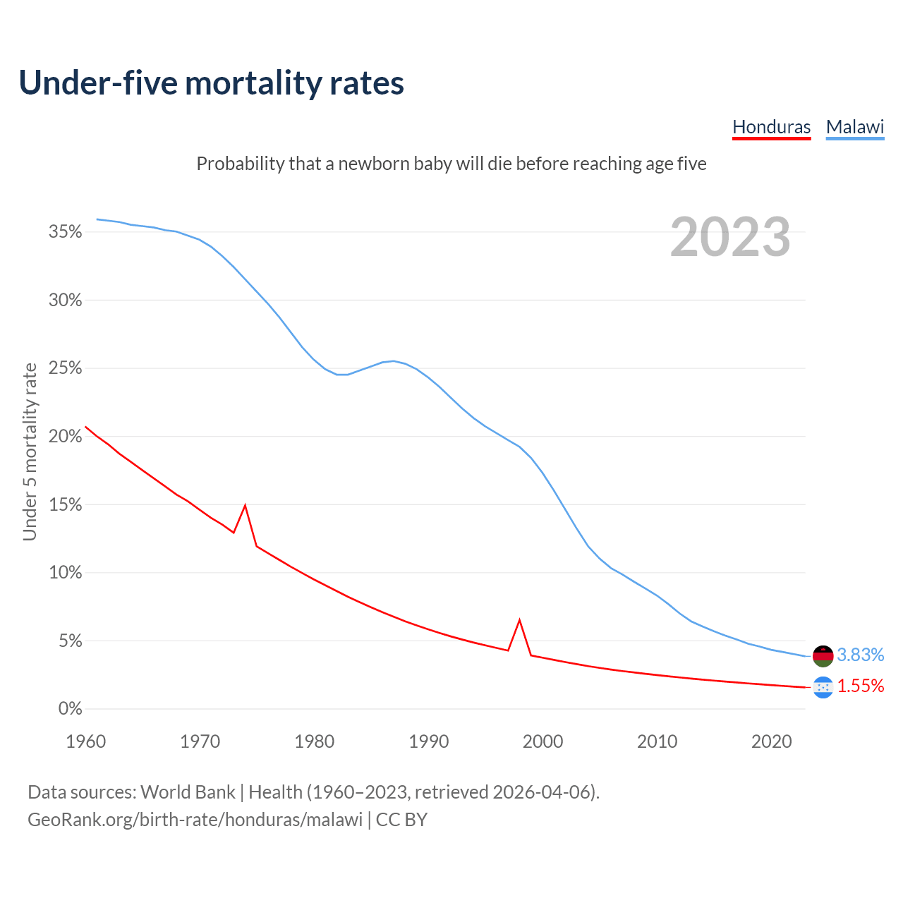 The chance that a newborn baby will die before reaching age five is 1.55% in Honduras and 3.83% in Malawi. Above is a chart with historical data on under-five mortality rates.