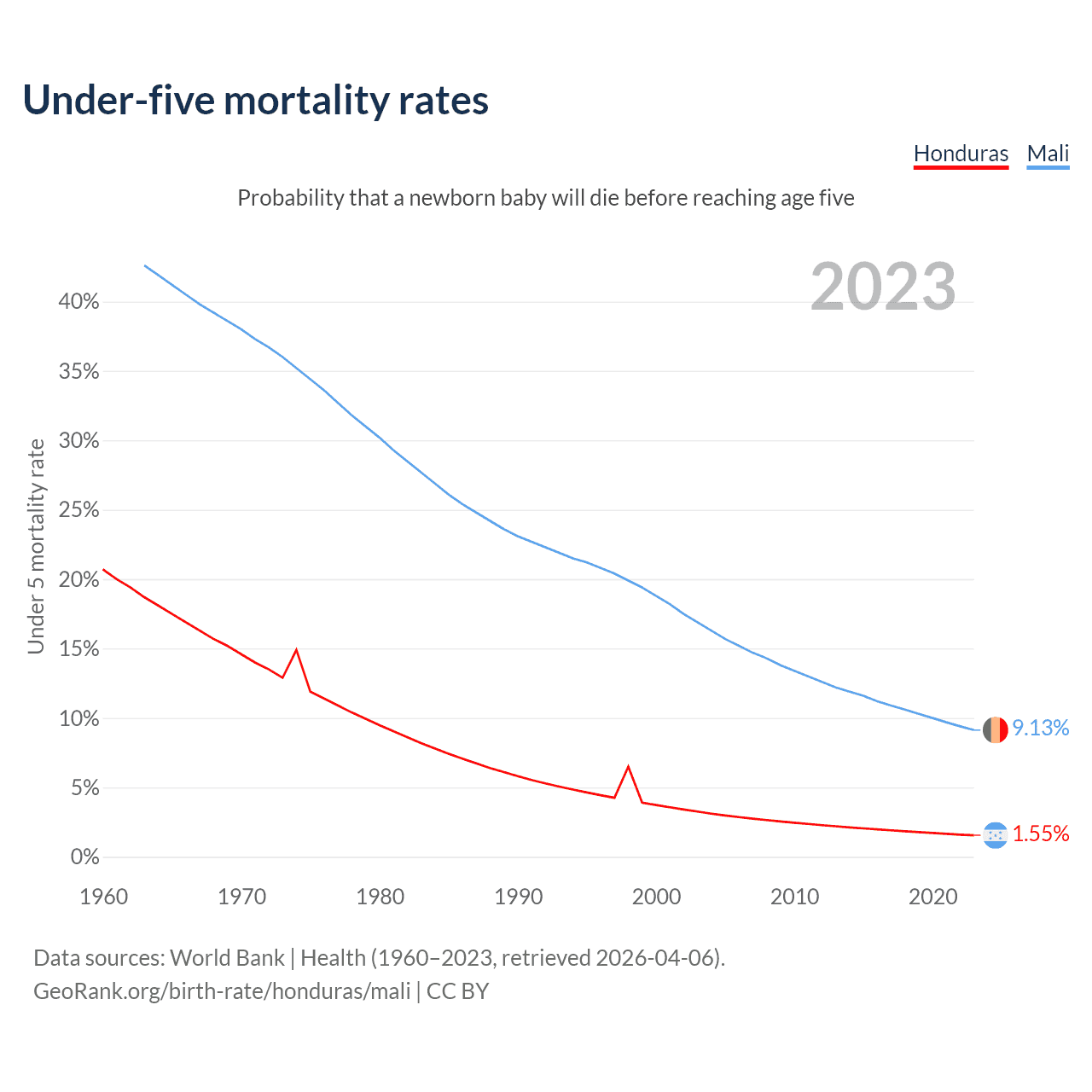 The chance that a newborn baby will die before reaching age five is 1.55% in Honduras and 9.13% in Mali. Above is a chart with historical data on under-five mortality rates.