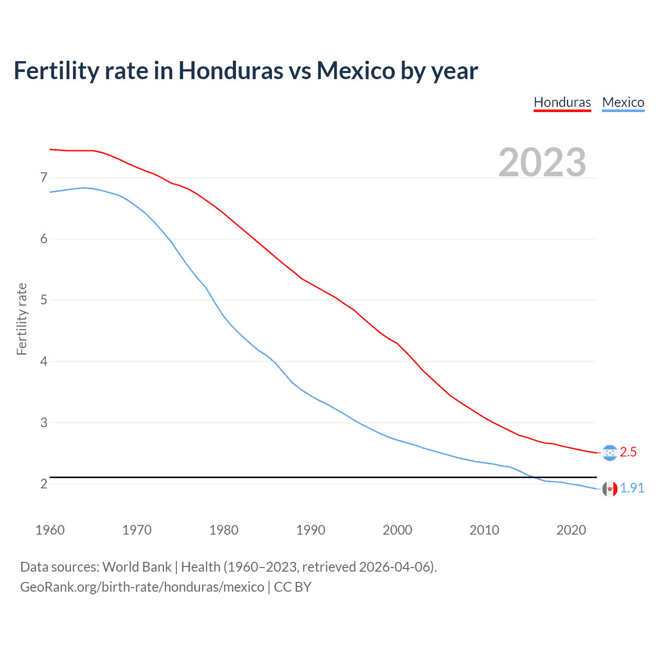 1960 vs 2023, the fertility rate has decreased by 66.5% in Honduras and by 71.8% in Mexico — in 1960, it was 7.46 and 6.76, respectively.