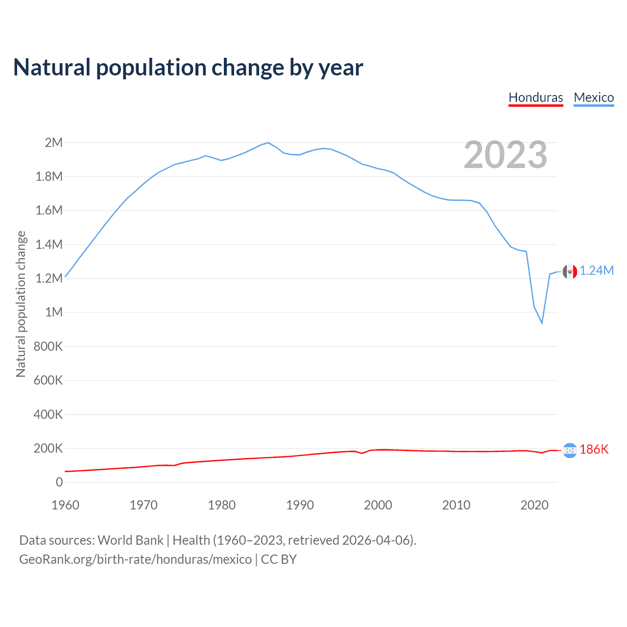 Data sources: World Bank | Health (1960–2023, retrieved 2026-04-06).