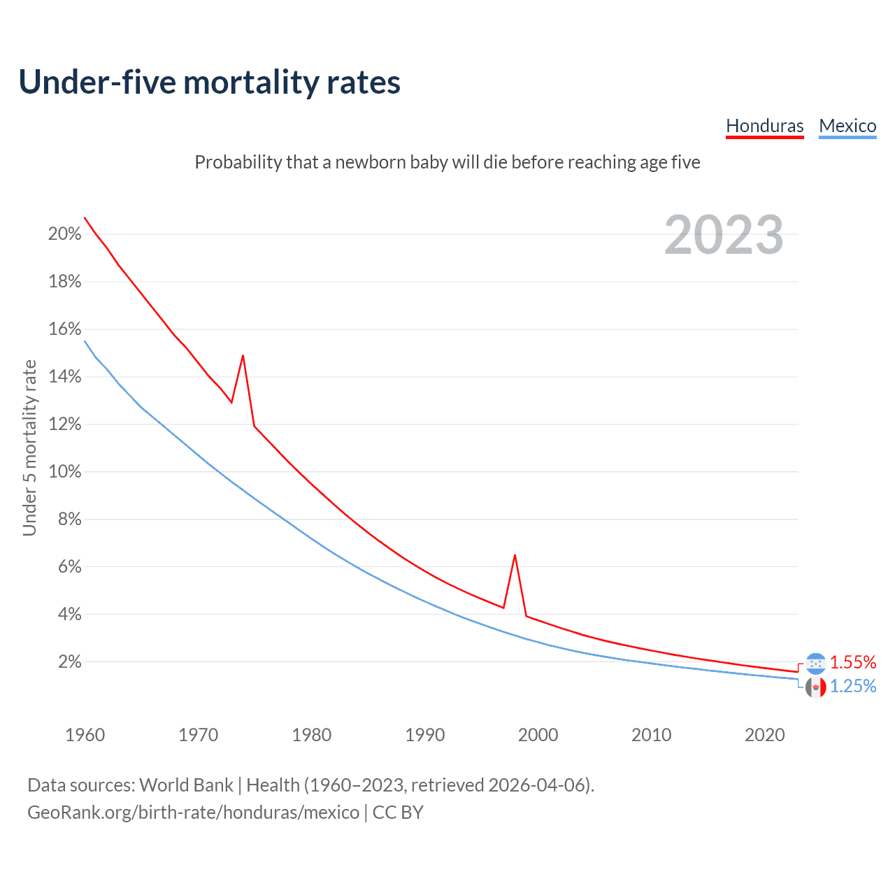 The chance that a newborn baby will die before reaching age five is 1.55% in Honduras and 1.25% in Mexico. Above is a chart with historical data on under-five mortality rates.