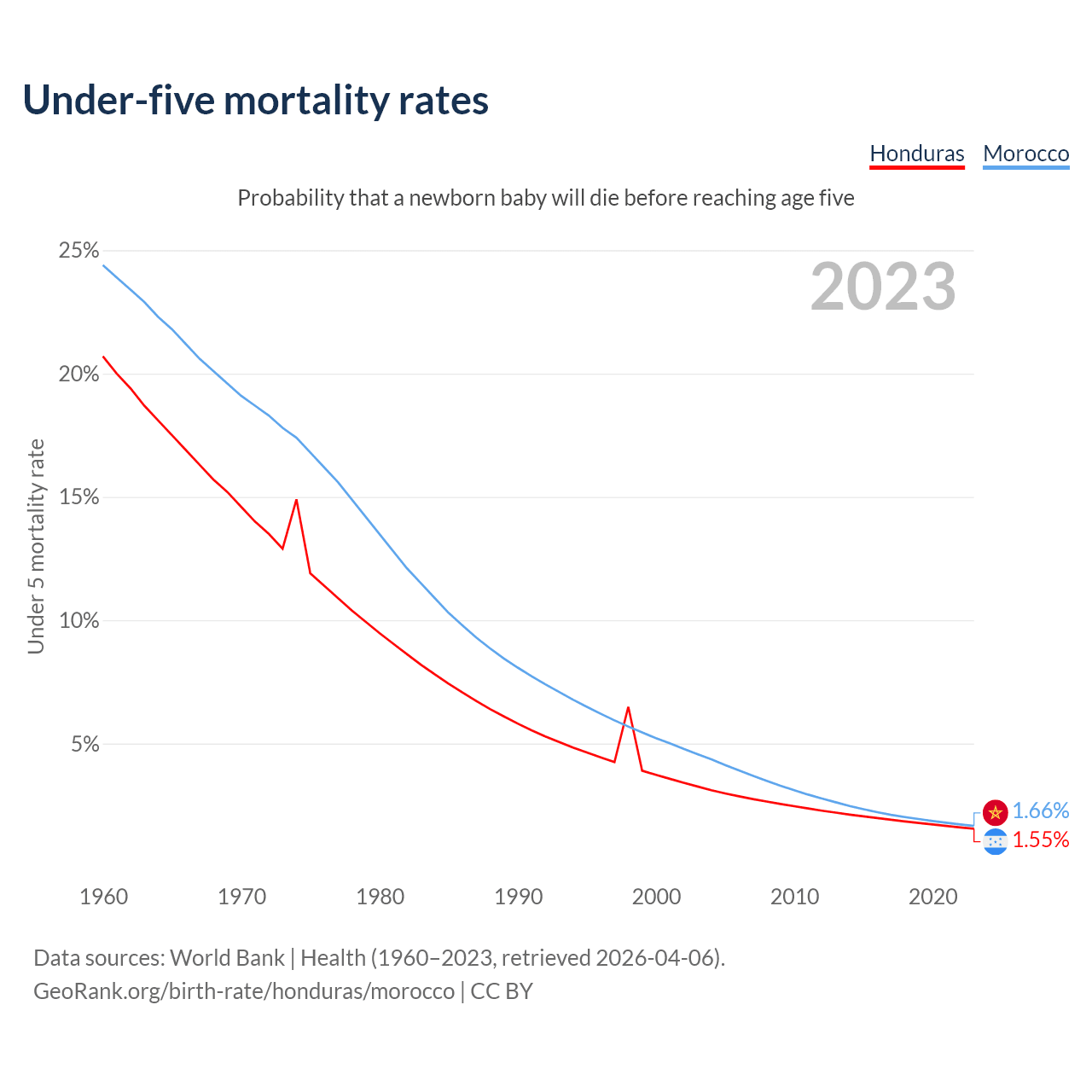 The chance that a newborn baby will die before reaching age five is 1.55% in Honduras and 1.66% in Morocco. Above is a chart with historical data on under-five mortality rates.