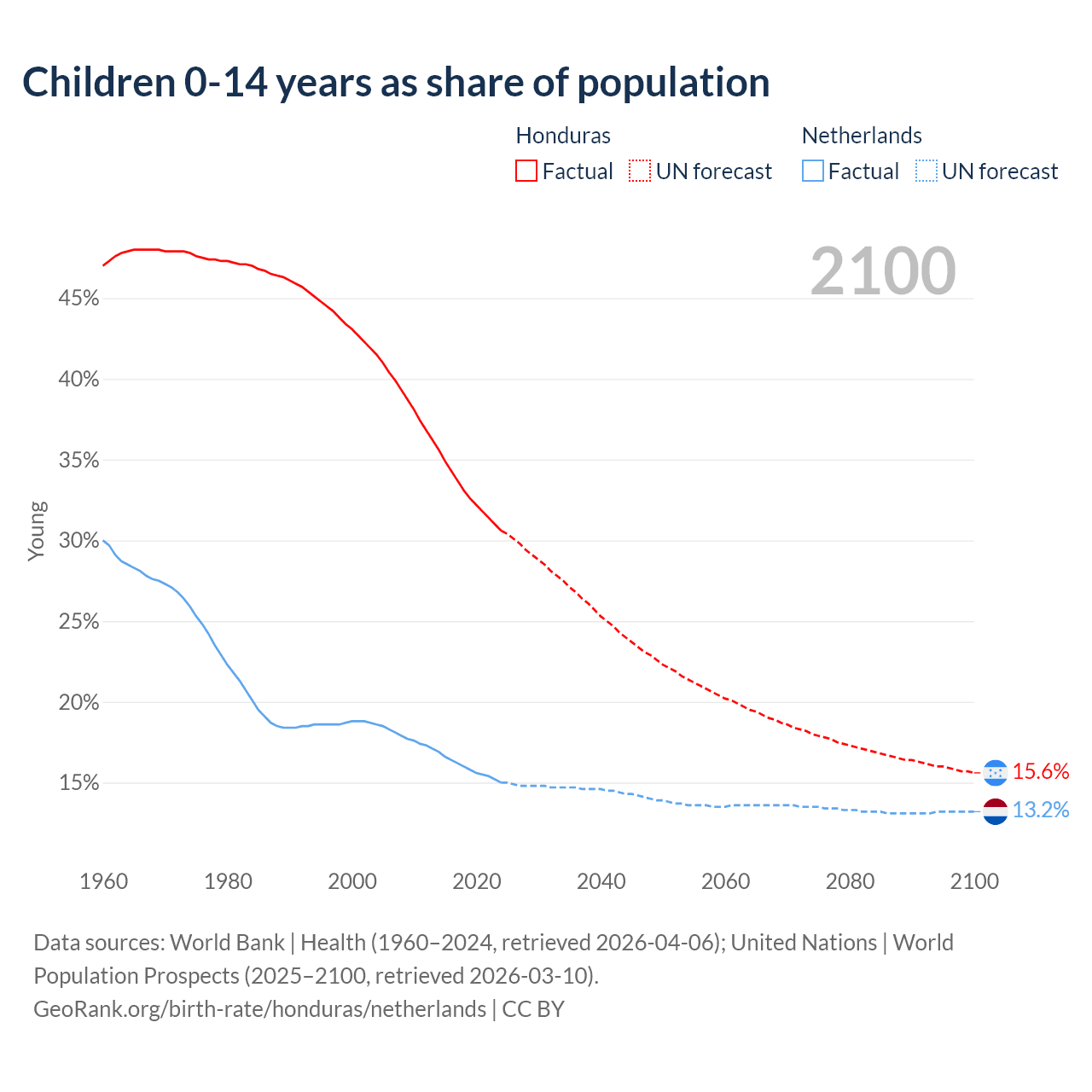 According to the latest available data on birth rates, the fertility rate in Honduras was 2.5 children per woman in 2023, compared to 1.43 in the Netherlands in 2023. The replacement level is considered to be 2.1 children per woman.