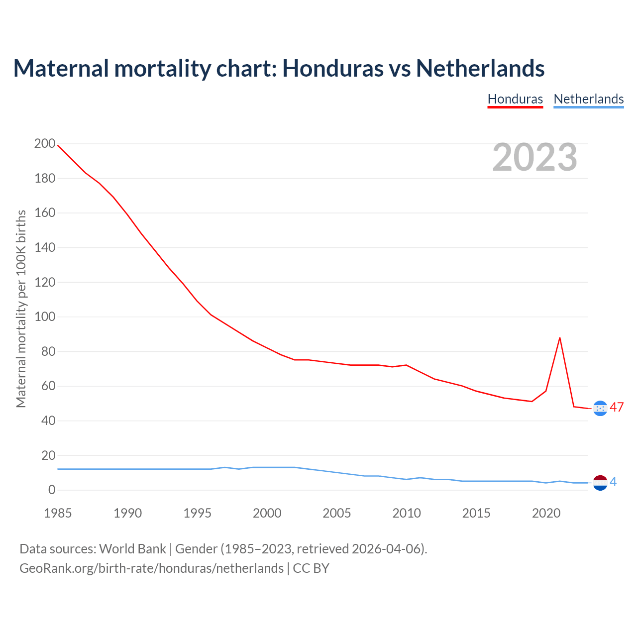 The maternal mortality rate, which is the probability of dying during childbirth or within 42 days of pregnancy termination, is 47 deaths per 100,000 live births in Honduras, compared to 4 deaths in the Netherlands.