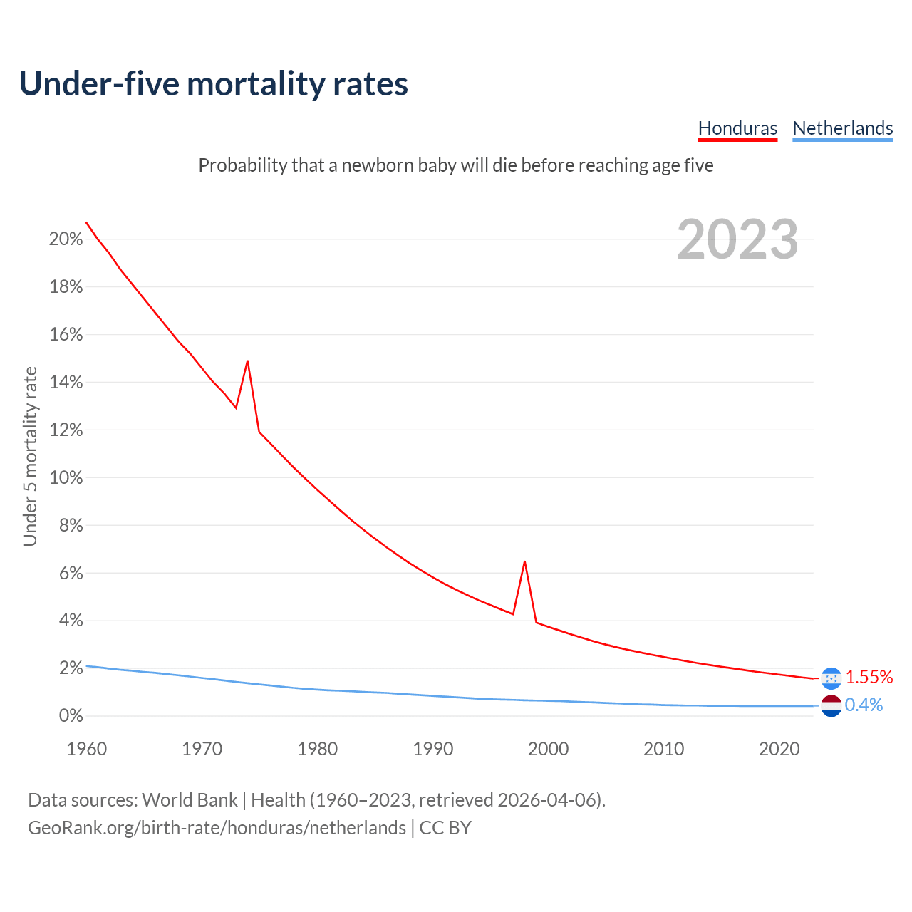 The chance that a newborn baby will die before reaching age five is 1.55% in Honduras and 0.4% in the Netherlands. Above is a chart with historical data on under-five mortality rates.