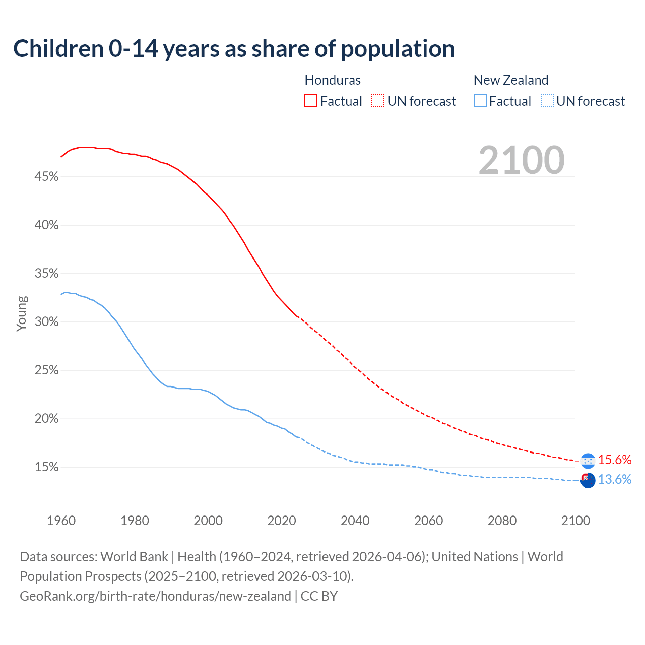 According to the latest available data on birth rates, the fertility rate in Honduras was 2.5 children per woman in 2023, compared to 1.56 in New Zealand in 2023. The replacement level is considered to be 2.1 children per woman.