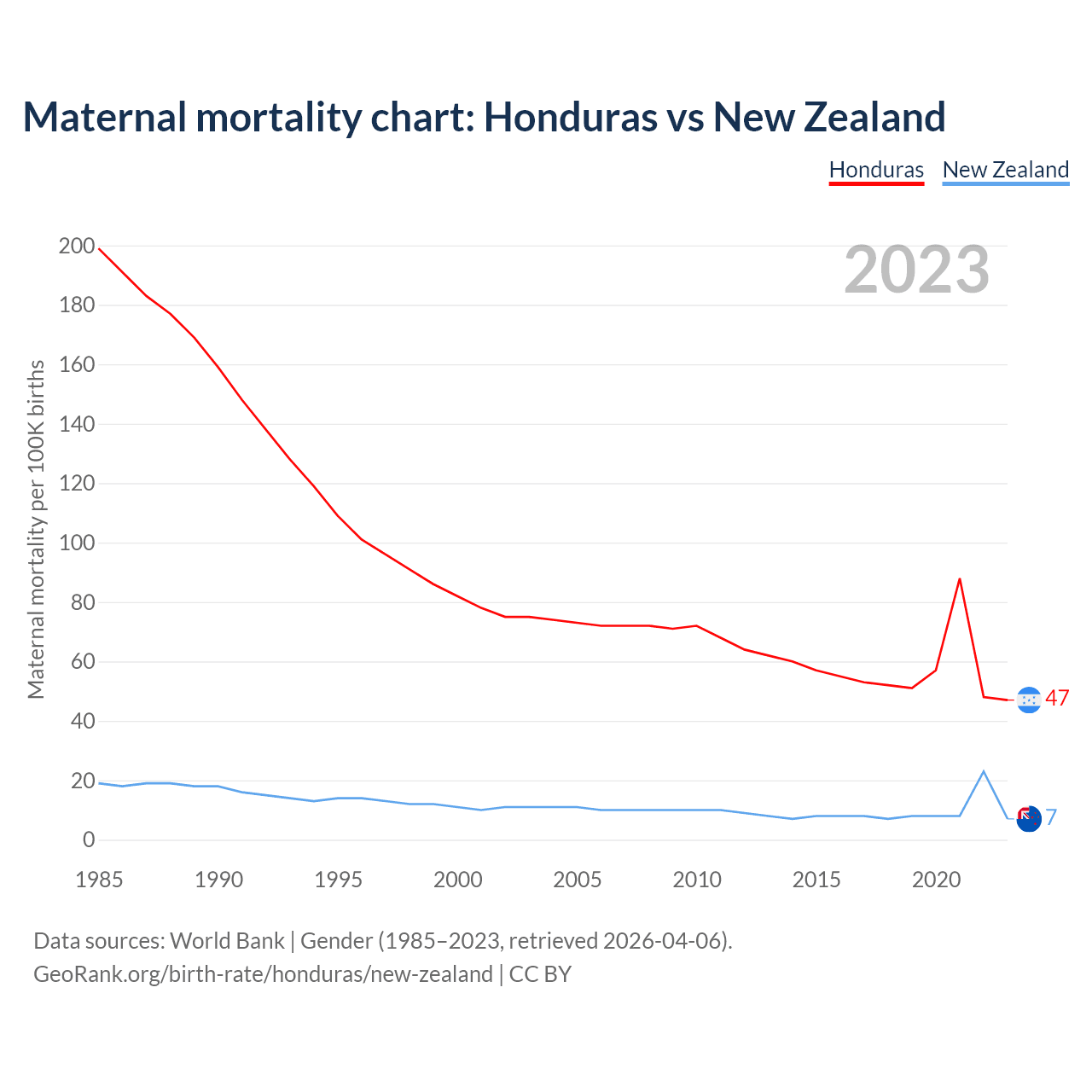 The maternal mortality rate, which is the probability of dying during childbirth or within 42 days of pregnancy termination, is 47 deaths per 100,000 live births in Honduras, compared to 7 deaths in New Zealand.