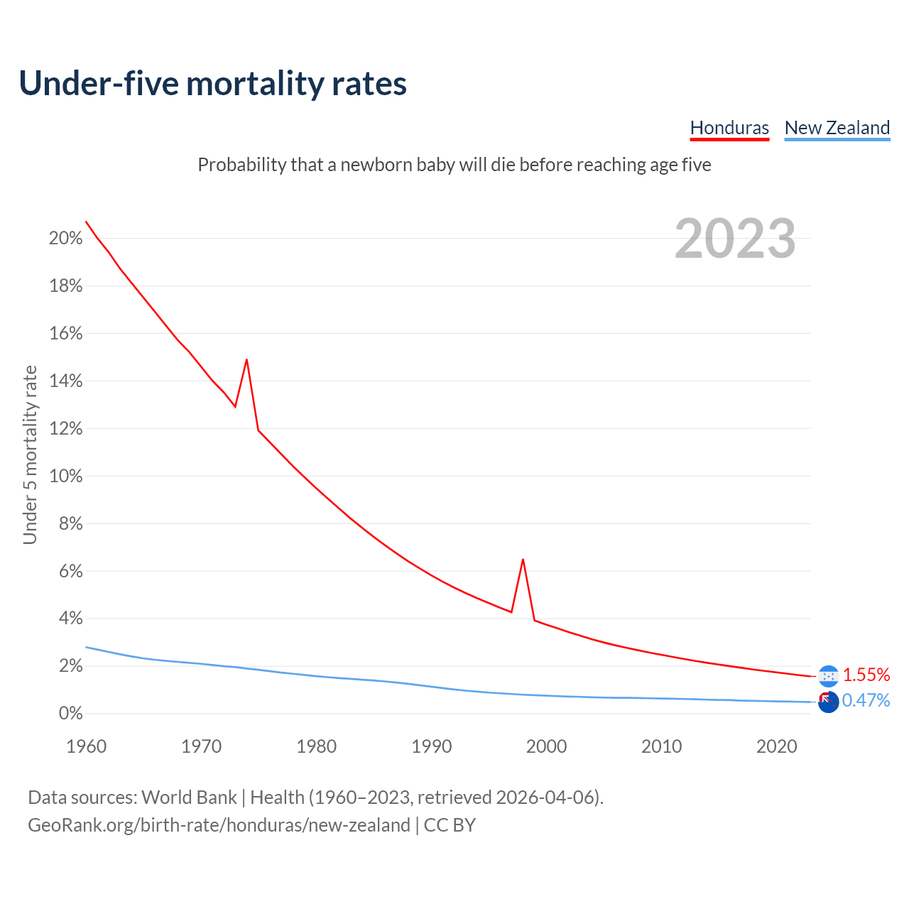 The chance that a newborn baby will die before reaching age five is 1.55% in Honduras and 0.47% in New Zealand. Above is a chart with historical data on under-five mortality rates.