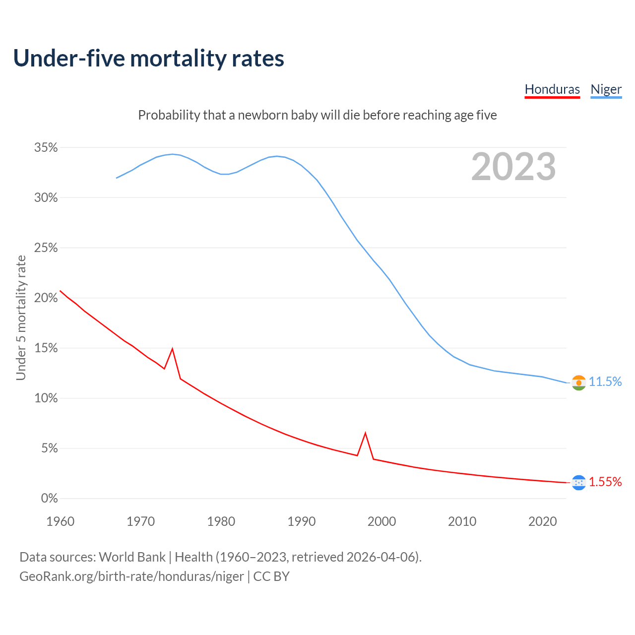The chance that a newborn baby will die before reaching age five is 1.55% in Honduras and 11.5% in Niger. Above is a chart with historical data on under-five mortality rates.
