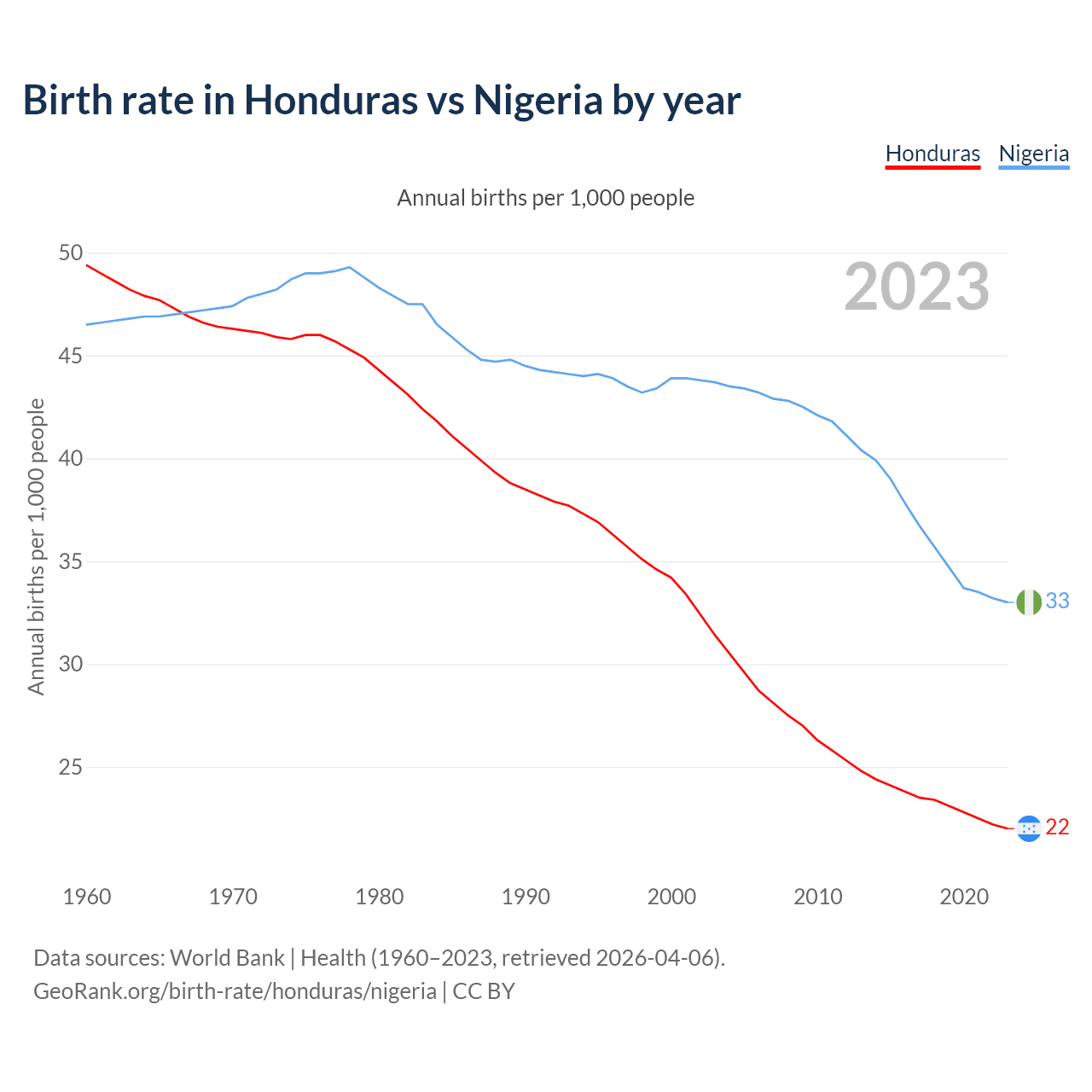According to the latest available data on birth rates, the fertility rate in Honduras was 2.5 children per woman in 2023, compared to 4.48 in Nigeria in 2023. The replacement level is considered to be 2.1 children per woman.