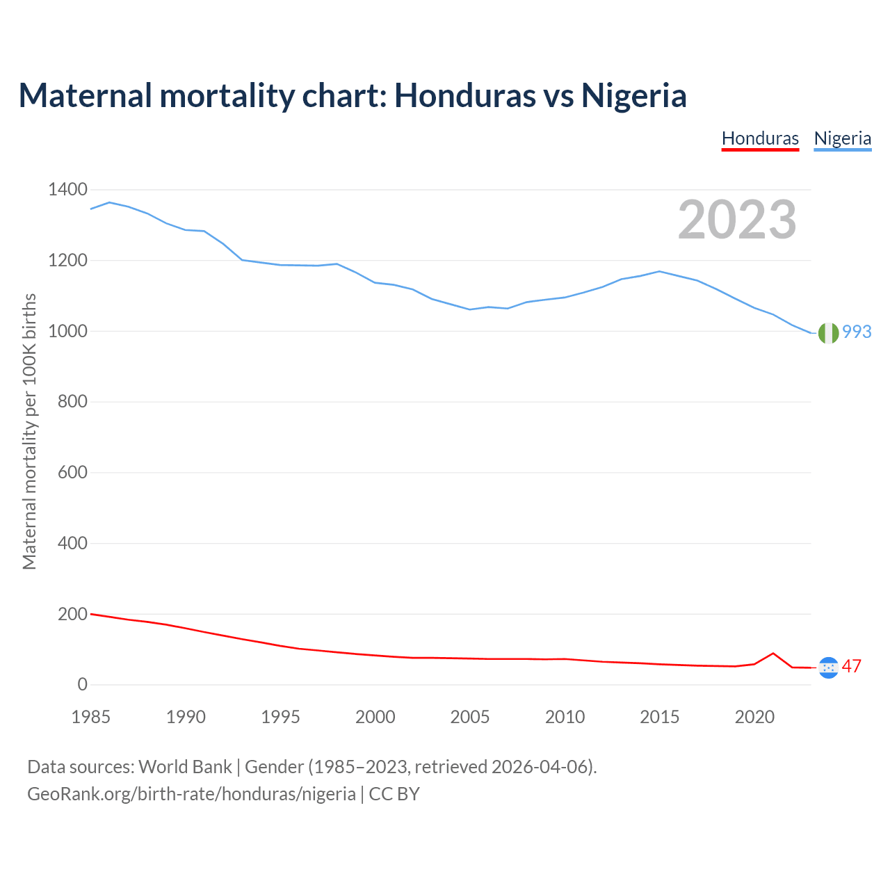 The maternal mortality rate, which is the probability of dying during childbirth or within 42 days of pregnancy termination, is 47 deaths per 100,000 live births in Honduras, compared to 993 deaths in Nigeria.