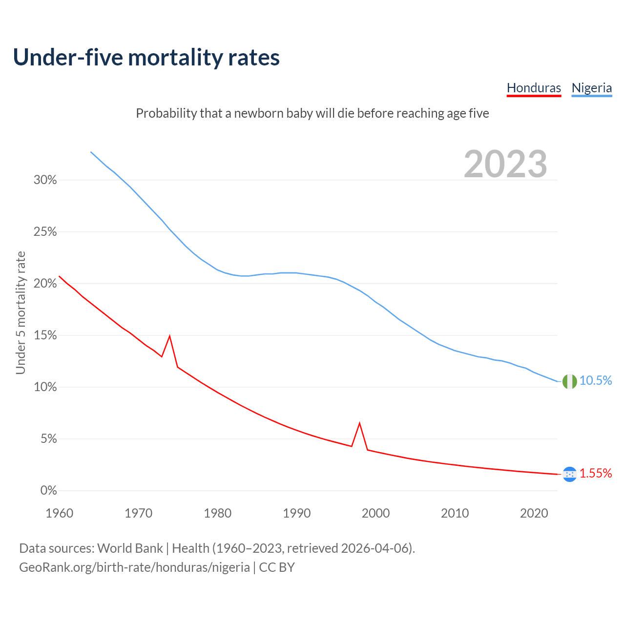The chance that a newborn baby will die before reaching age five is 1.55% in Honduras and 10.5% in Nigeria. Above is a chart with historical data on under-five mortality rates.