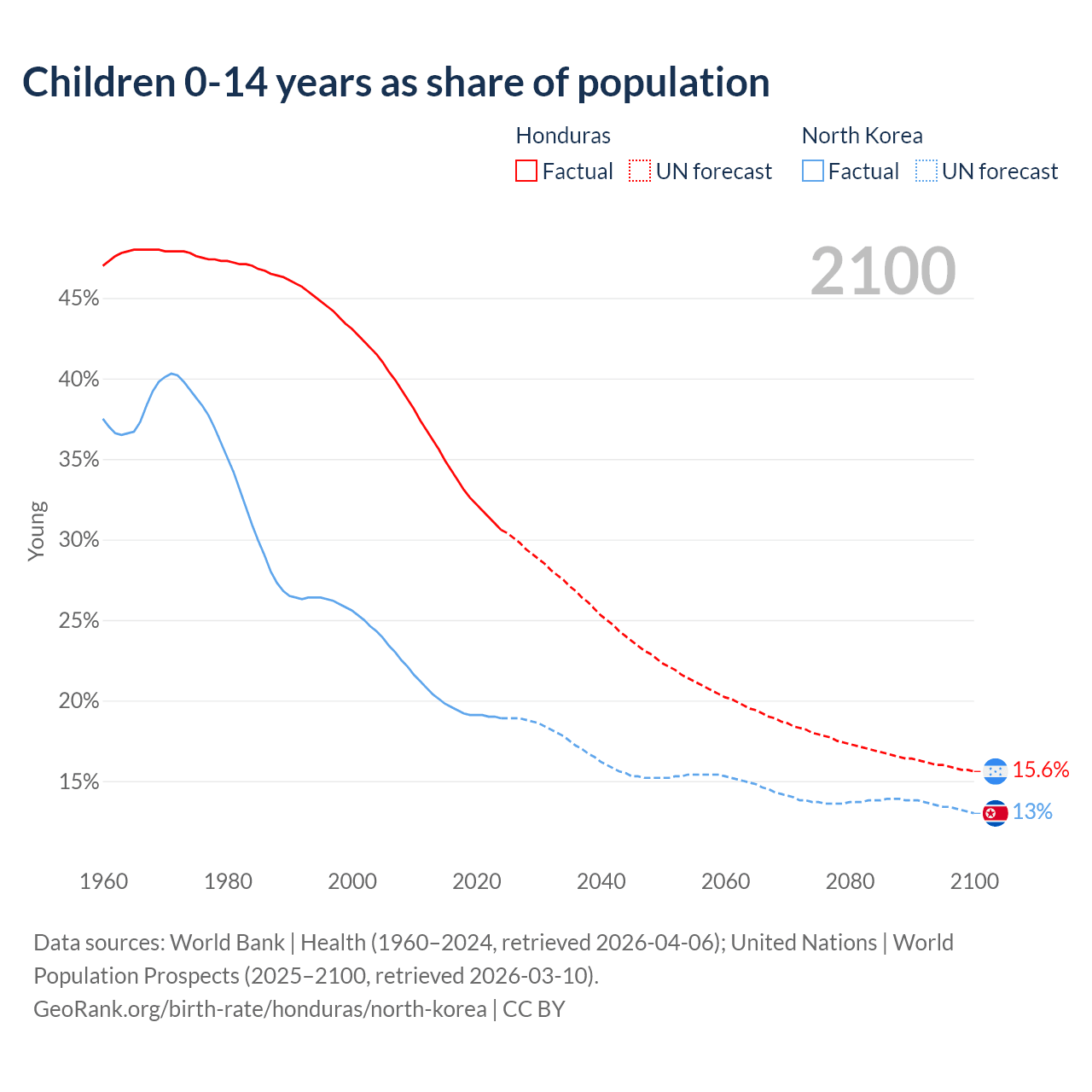 According to the latest available data on birth rates, the fertility rate in Honduras was 2.5 children per woman in 2023, compared to 1.78 in North Korea in 2023. The replacement level is considered to be 2.1 children per woman.