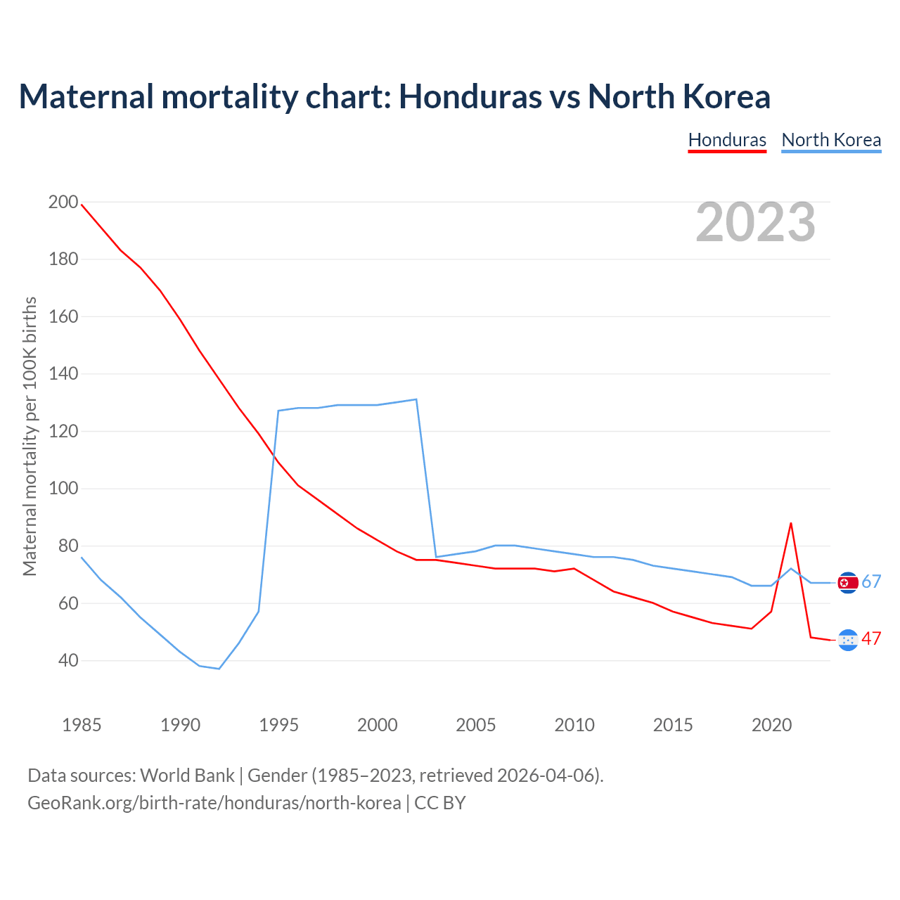 The maternal mortality rate, which is the probability of dying during childbirth or within 42 days of pregnancy termination, is 47 deaths per 100,000 live births in Honduras, compared to 67 deaths in North Korea.