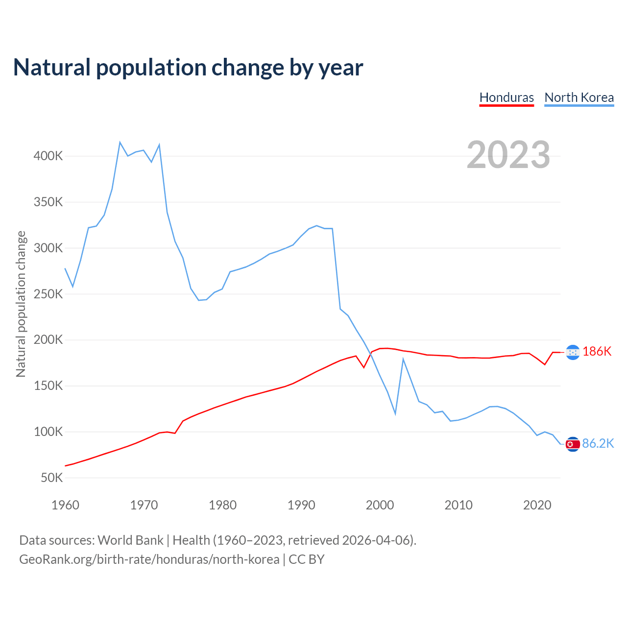 Honduras has an annual birth rate of 22 births per 1,000 people, compared to 12.9 for North Korea. The average number of children a woman is expected to have during her lifetime — the fertility rate, is 2.5 in Honduras and 1.78 in North Korea — 28.8% difference.