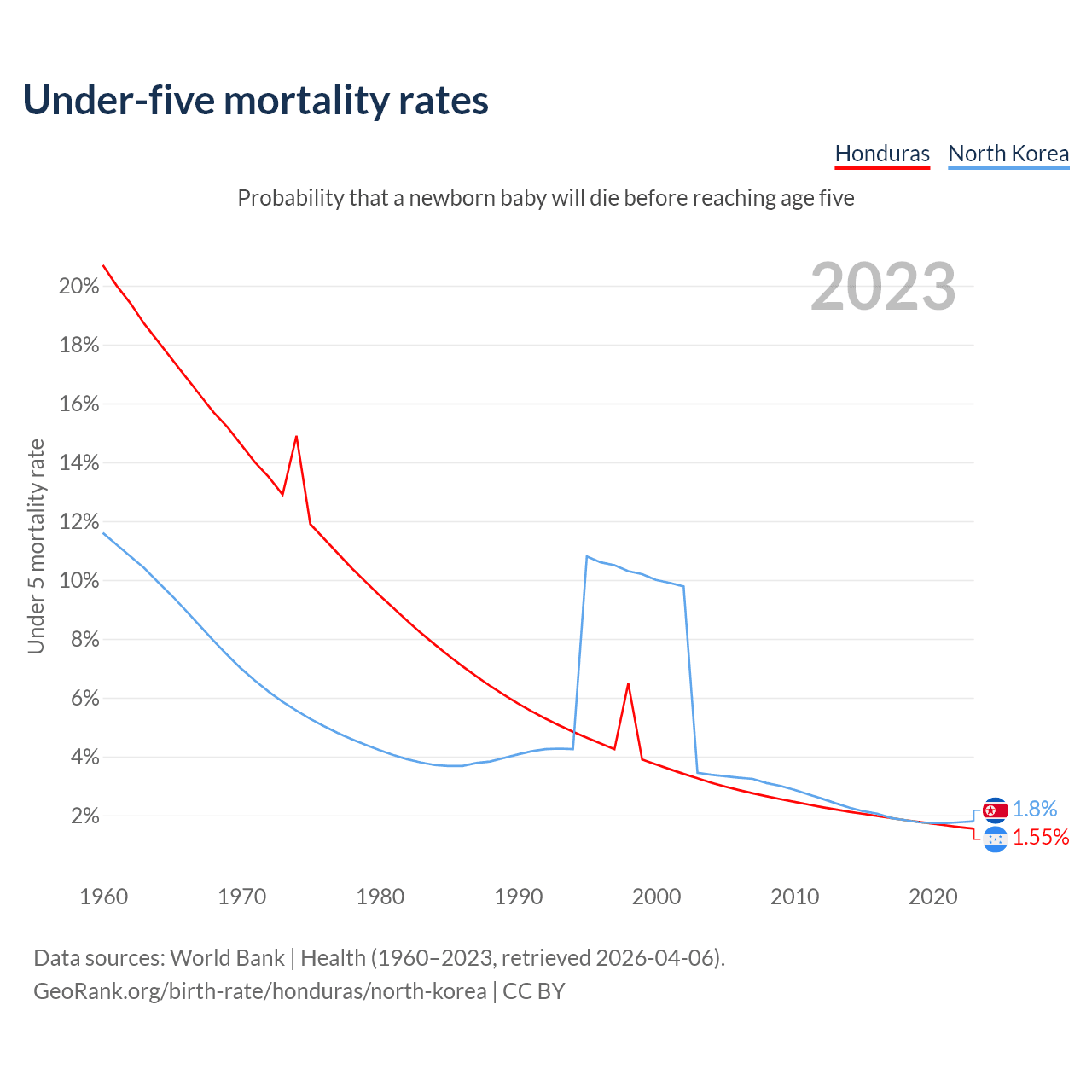 The chance that a newborn baby will die before reaching age five is 1.55% in Honduras and 1.8% in North Korea. Above is a chart with historical data on under-five mortality rates.