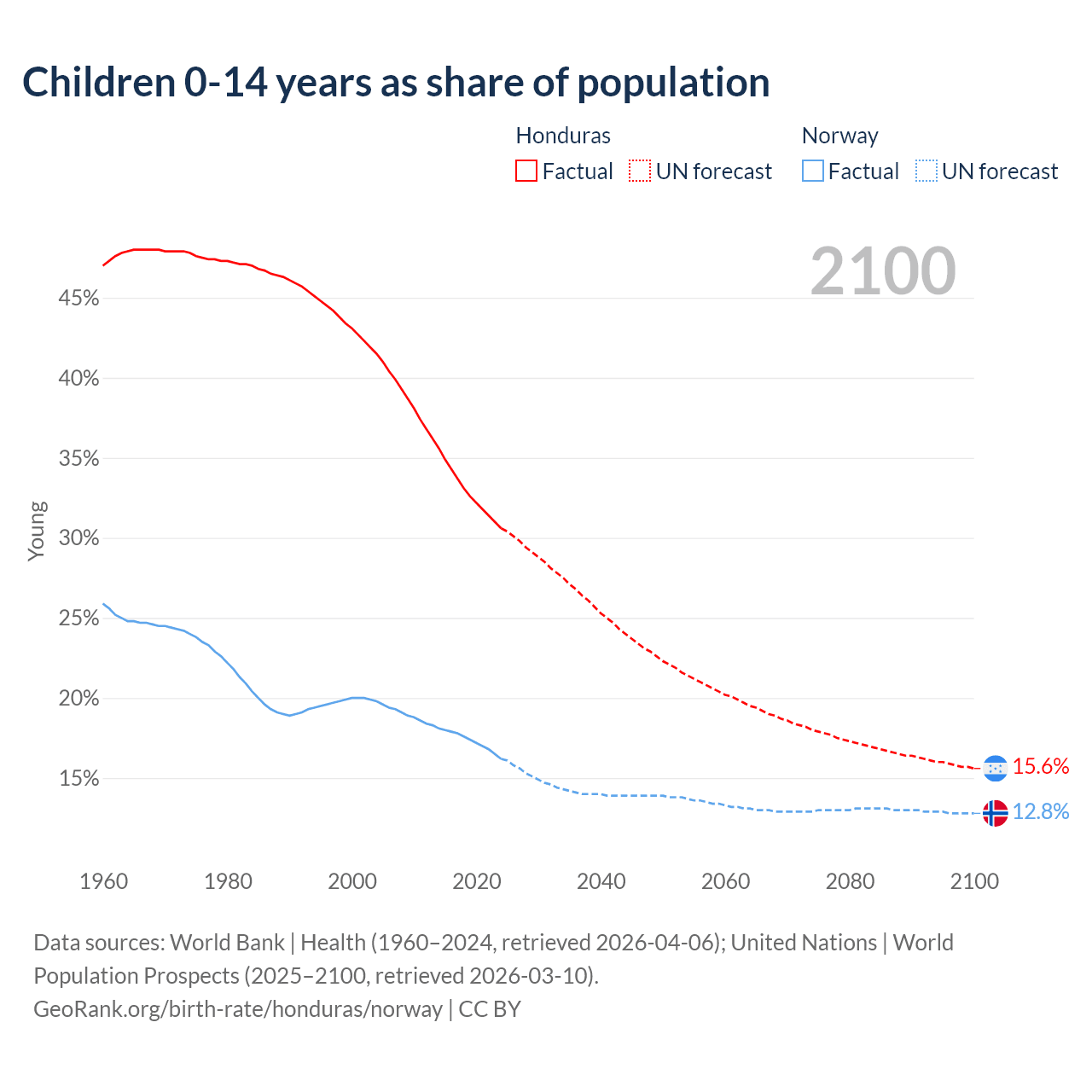 According to the latest available data on birth rates, the fertility rate in Honduras was 2.5 children per woman in 2023, compared to 1.4 in Norway in 2023. The replacement level is considered to be 2.1 children per woman.