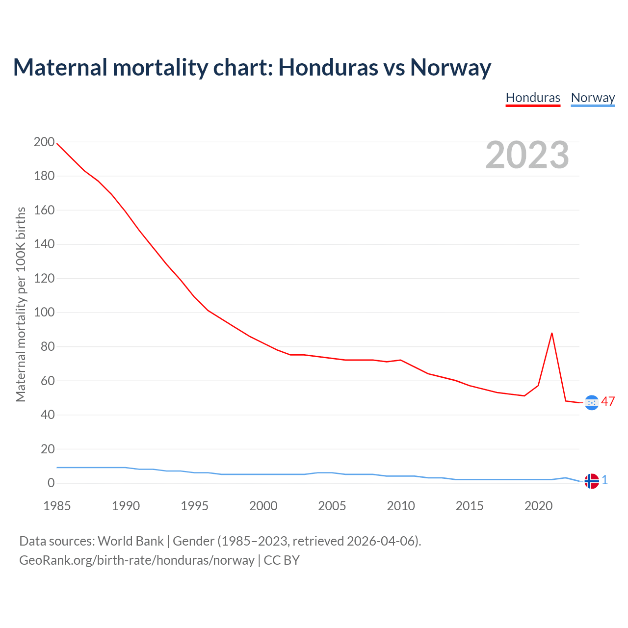 The maternal mortality rate, which is the probability of dying during childbirth or within 42 days of pregnancy termination, is 47 deaths per 100,000 live births in Honduras, compared to 1 deaths in Norway.