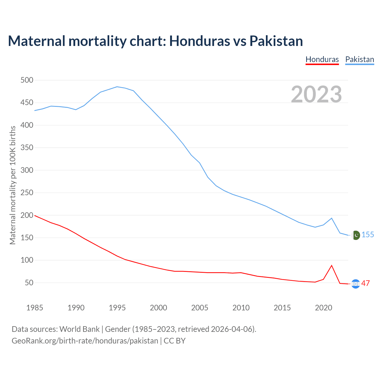 The maternal mortality rate, which is the probability of dying during childbirth or within 42 days of pregnancy termination, is 47 deaths per 100,000 live births in Honduras, compared to 155 deaths in Pakistan.