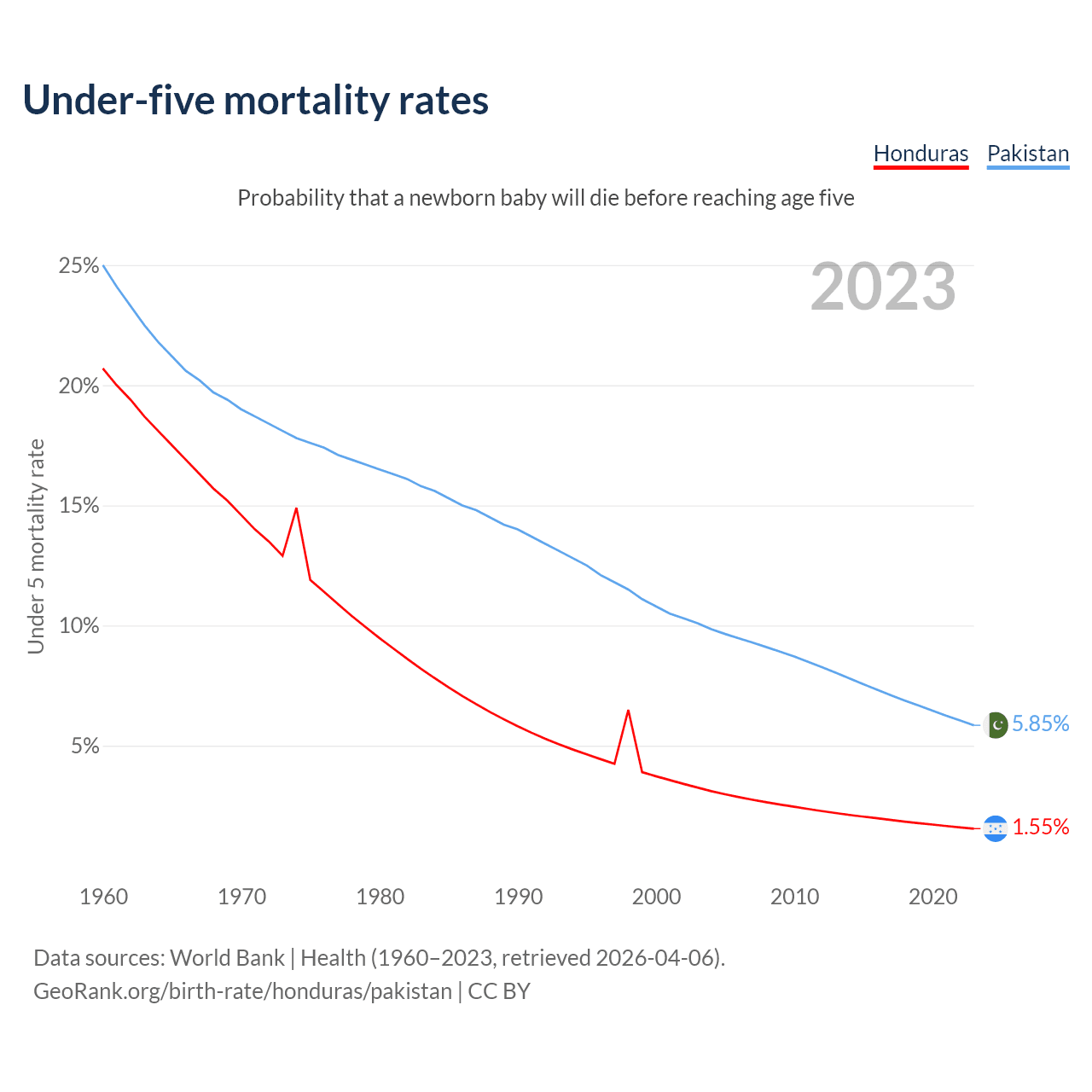 The chance that a newborn baby will die before reaching age five is 1.55% in Honduras and 5.85% in Pakistan. Above is a chart with historical data on under-five mortality rates.