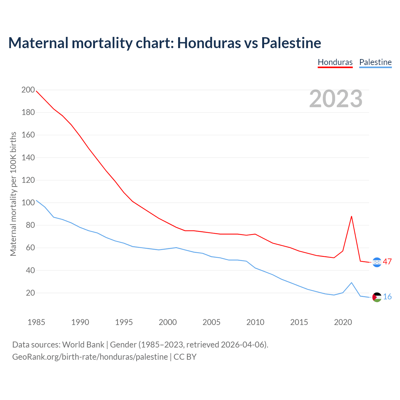The maternal mortality rate, which is the probability of dying during childbirth or within 42 days of pregnancy termination, is 47 deaths per 100,000 live births in Honduras, compared to 16 deaths in Palestine.