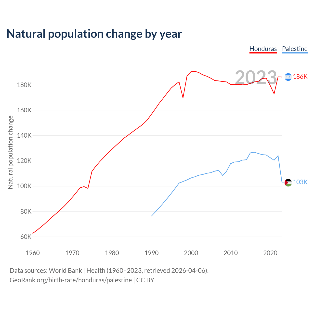 According to the latest available data on birth rates, the fertility rate in Honduras was 2.5 children per woman in 2023, compared to 3.31 in Palestine in 2023. The replacement level is considered to be 2.1 children per woman.