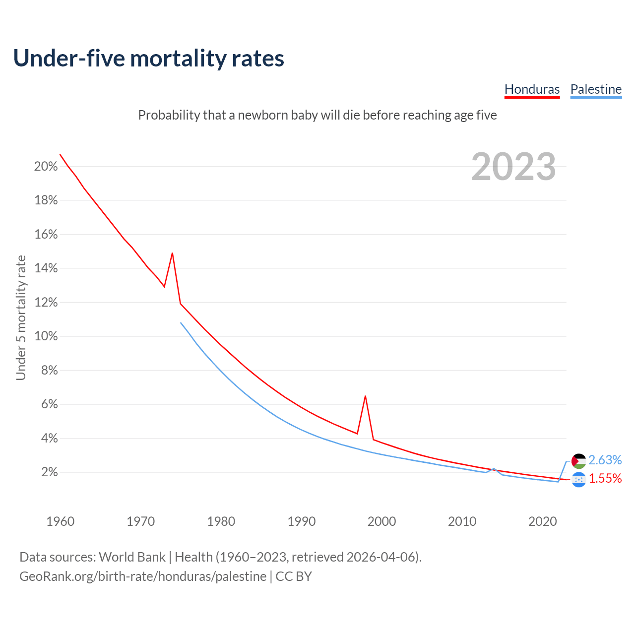 The chance that a newborn baby will die before reaching age five is 1.55% in Honduras and 2.63% in Palestine. Above is a chart with historical data on under-five mortality rates.