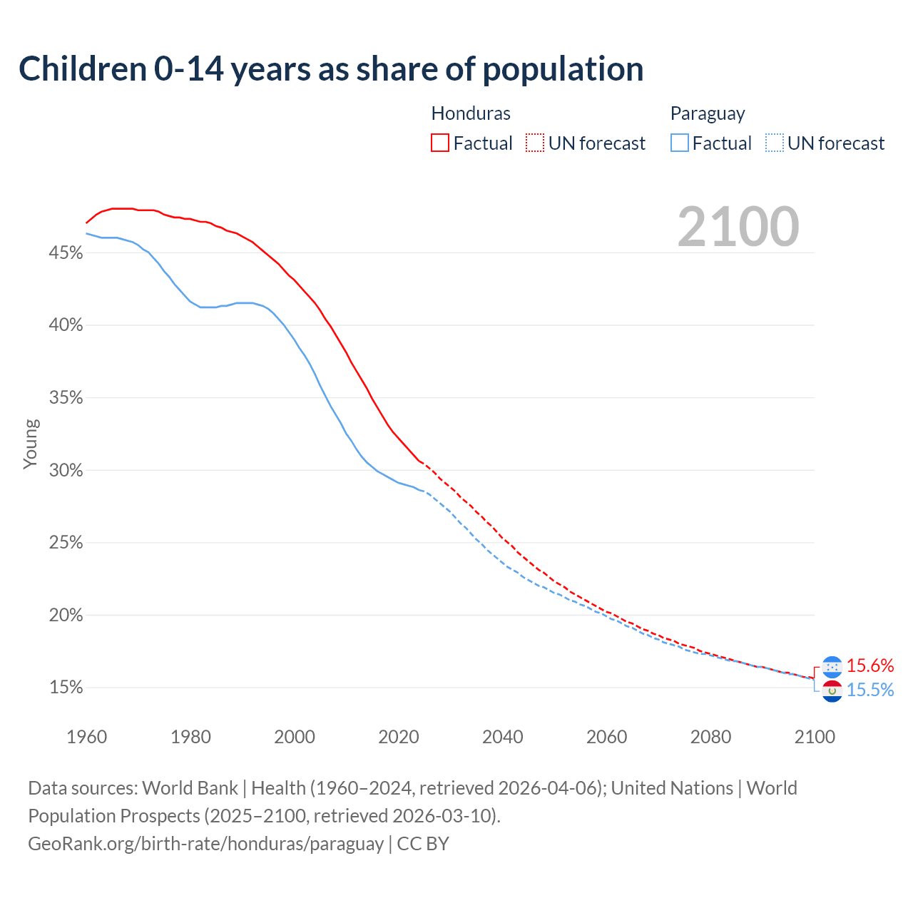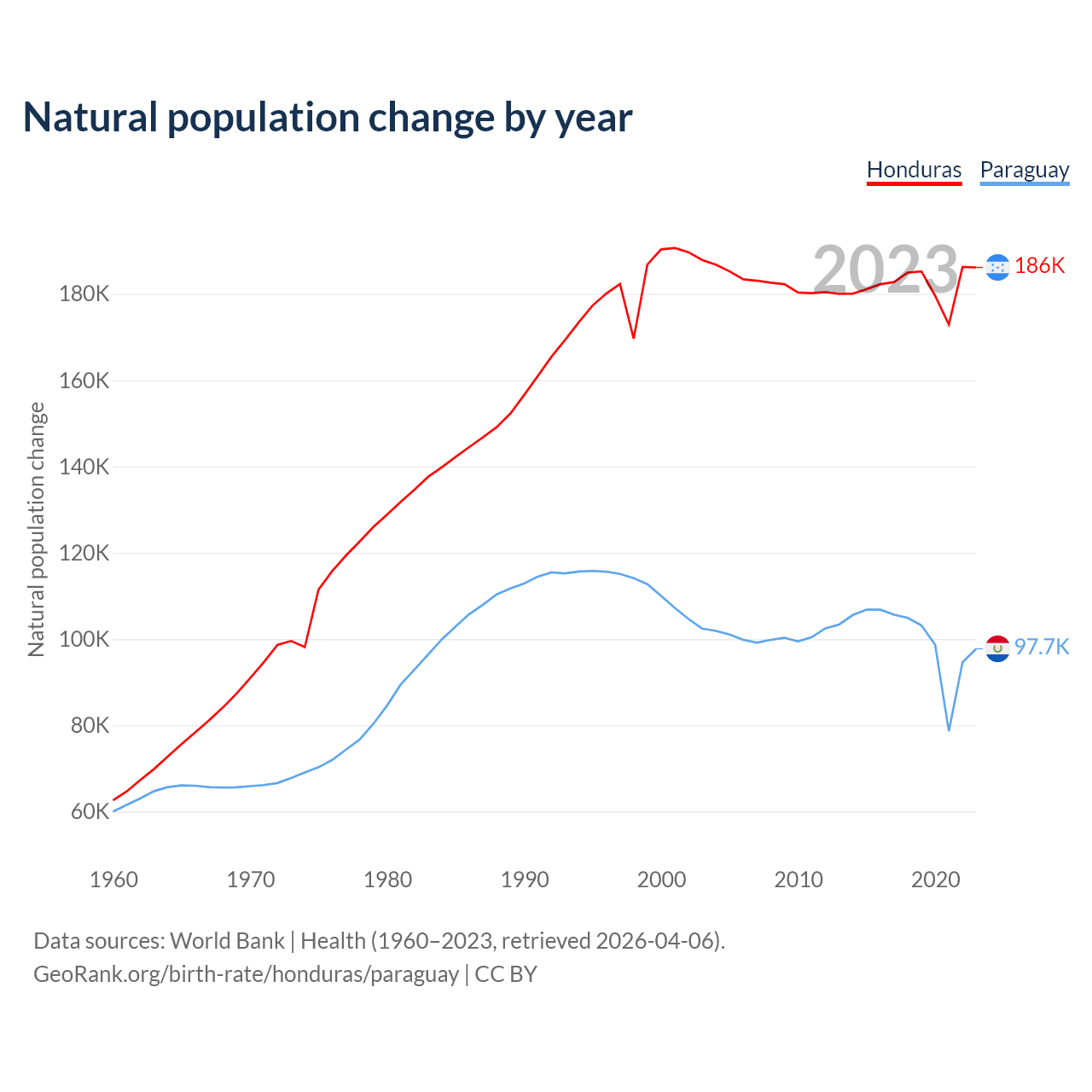 According to the latest available data on birth rates, the fertility rate in Honduras was 2.5 children per woman in 2023, compared to 2.42 in Paraguay in 2023. The replacement level is considered to be 2.1 children per woman.