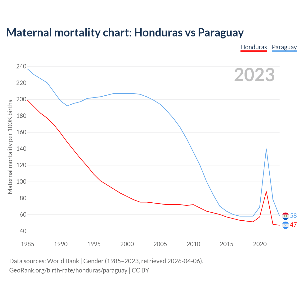The maternal mortality rate, which is the probability of dying during childbirth or within 42 days of pregnancy termination, is 47 deaths per 100,000 live births in Honduras, compared to 58 deaths in Paraguay.