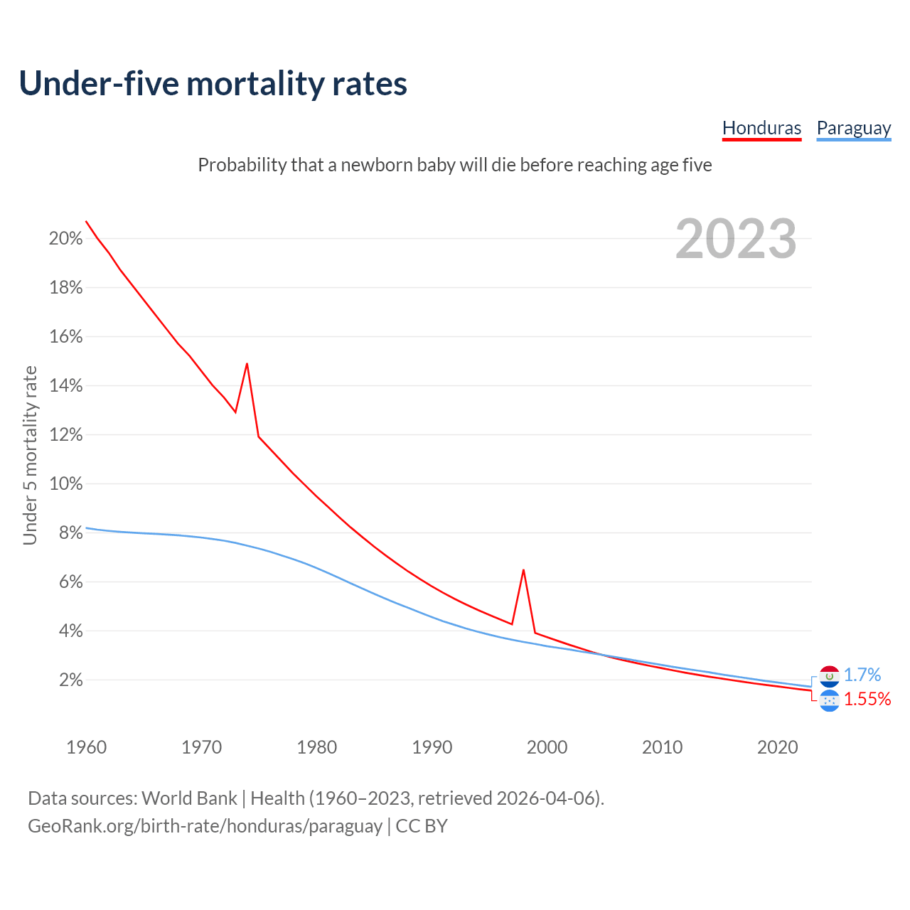 The chance that a newborn baby will die before reaching age five is 1.55% in Honduras and 1.7% in Paraguay. Above is a chart with historical data on under-five mortality rates.