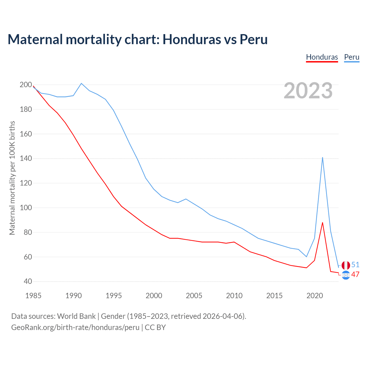 The maternal mortality rate, which is the probability of dying during childbirth or within 42 days of pregnancy termination, is 47 deaths per 100,000 live births in Honduras, compared to 51 deaths in Peru.