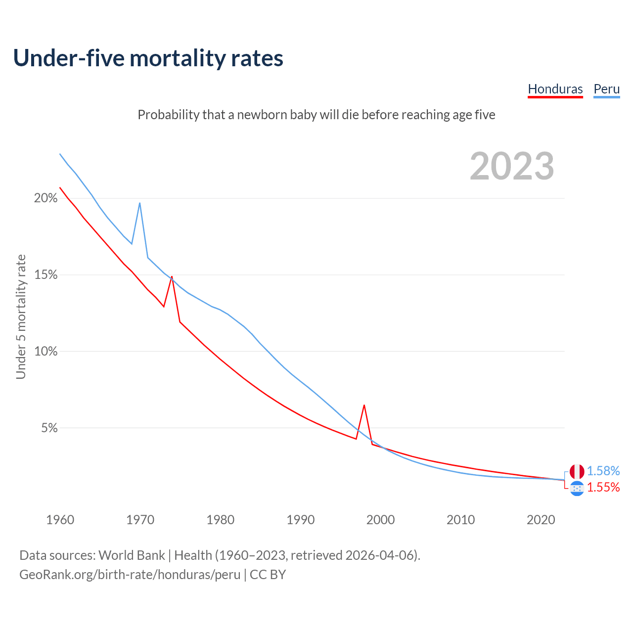 The chance that a newborn baby will die before reaching age five is 1.55% in Honduras and 1.58% in Peru. Above is a chart with historical data on under-five mortality rates.