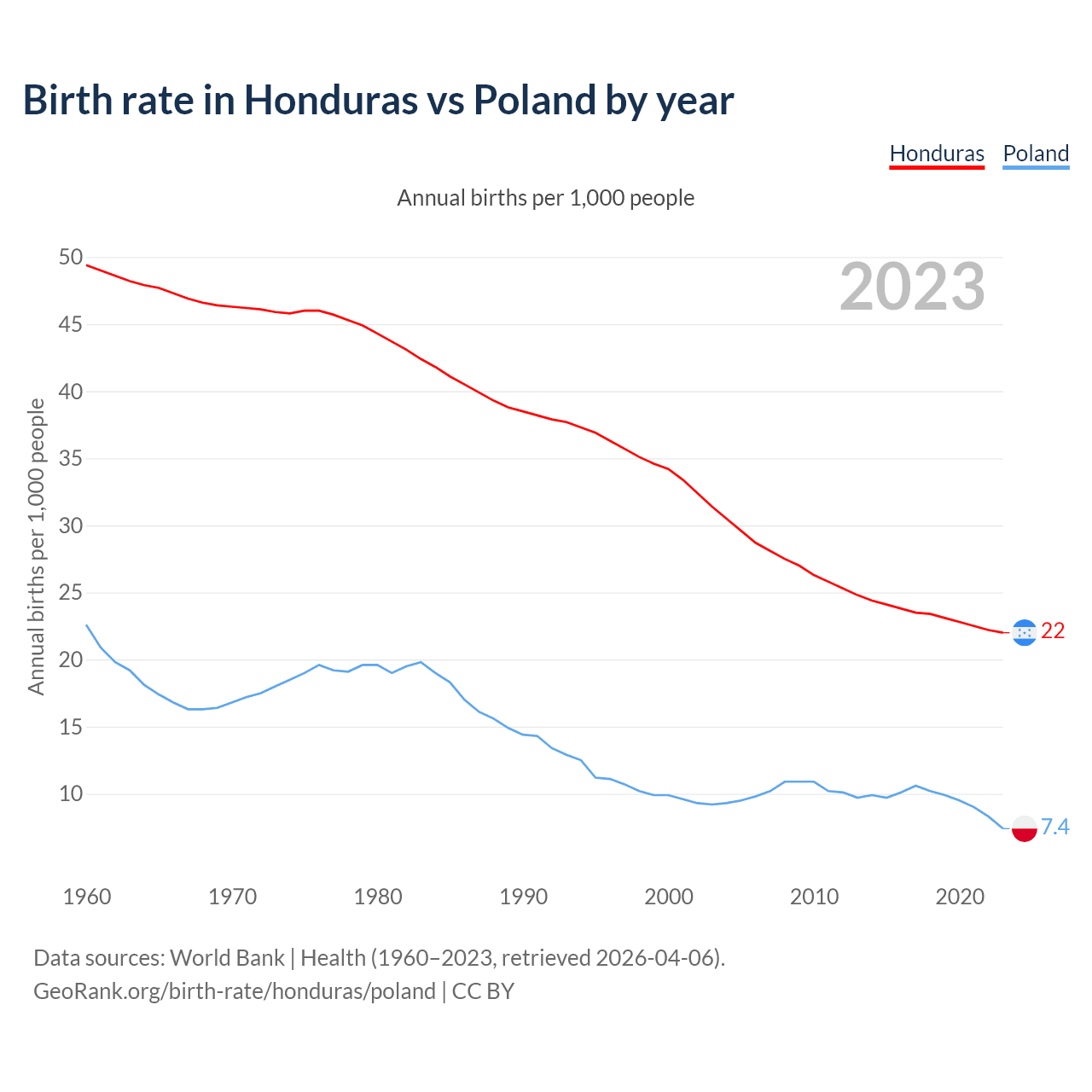 Honduras has an annual birth rate of 22 births per 1,000 people, compared to 7.4 for Poland. The average number of children a woman is expected to have during her lifetime — the fertility rate, is 2.5 in Honduras and 1.16 in Poland — 53.7% difference.