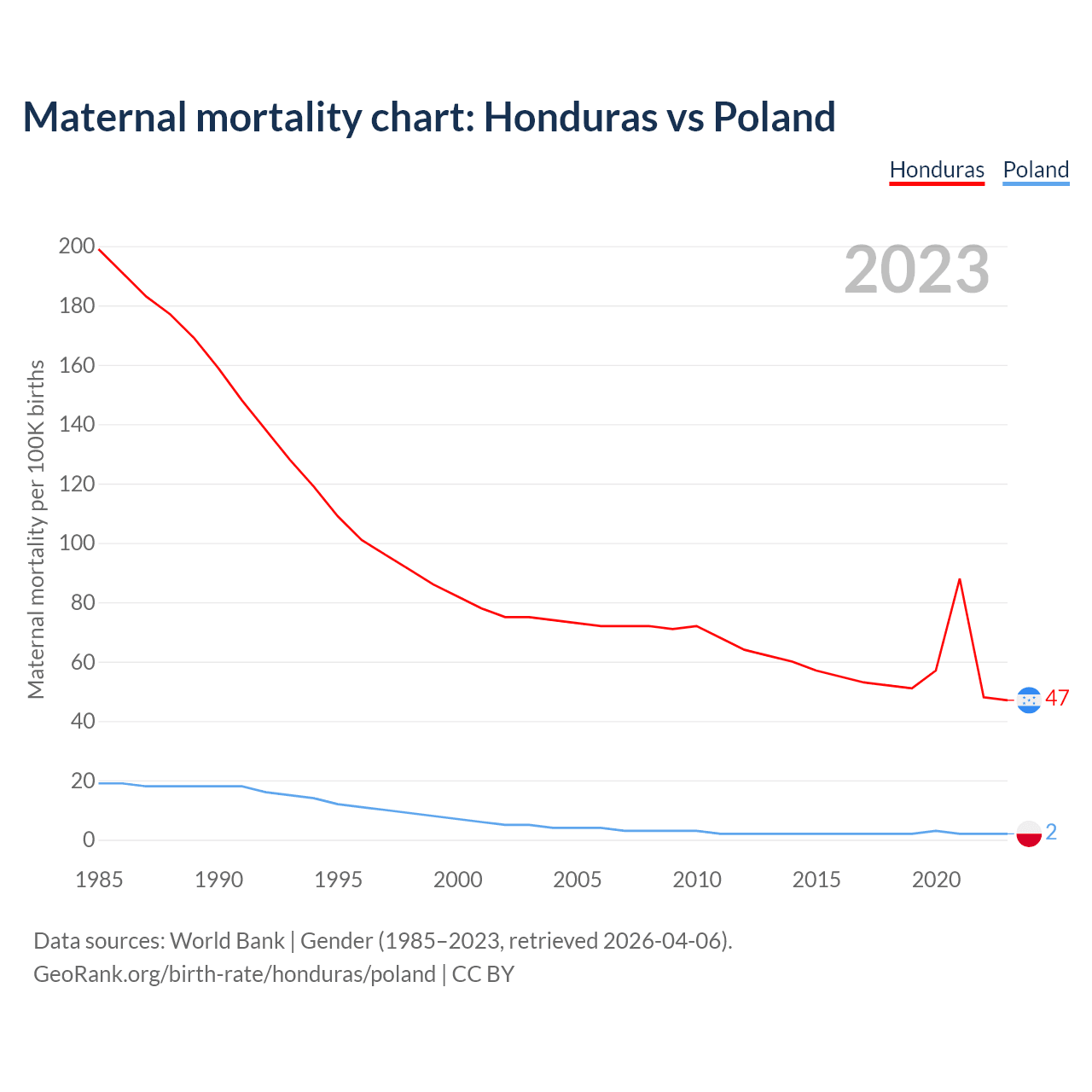 The maternal mortality rate, which is the probability of dying during childbirth or within 42 days of pregnancy termination, is 47 deaths per 100,000 live births in Honduras, compared to 2 deaths in Poland.