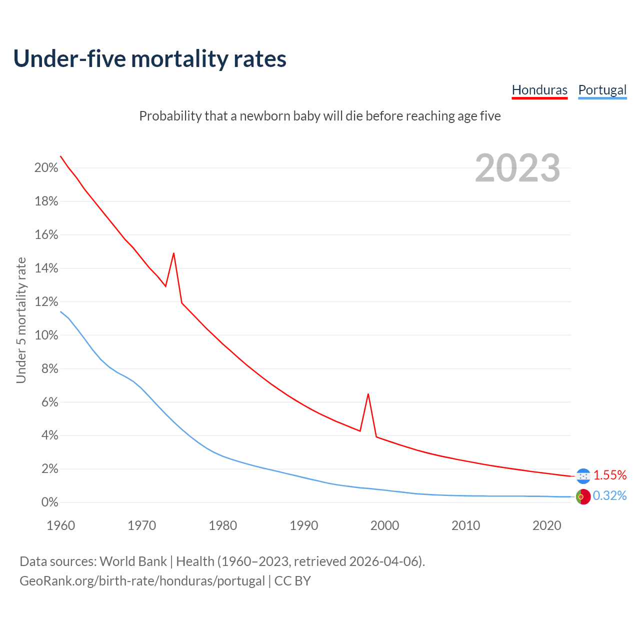 The chance that a newborn baby will die before reaching age five is 1.55% in Honduras and 0.32% in Portugal. Above is a chart with historical data on under-five mortality rates.